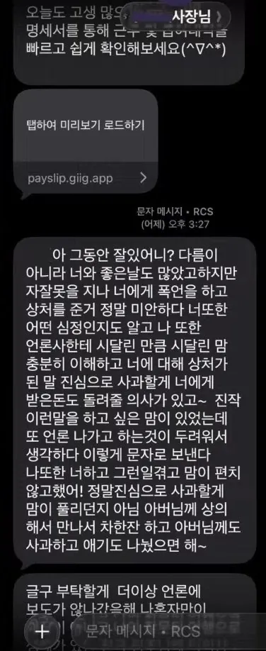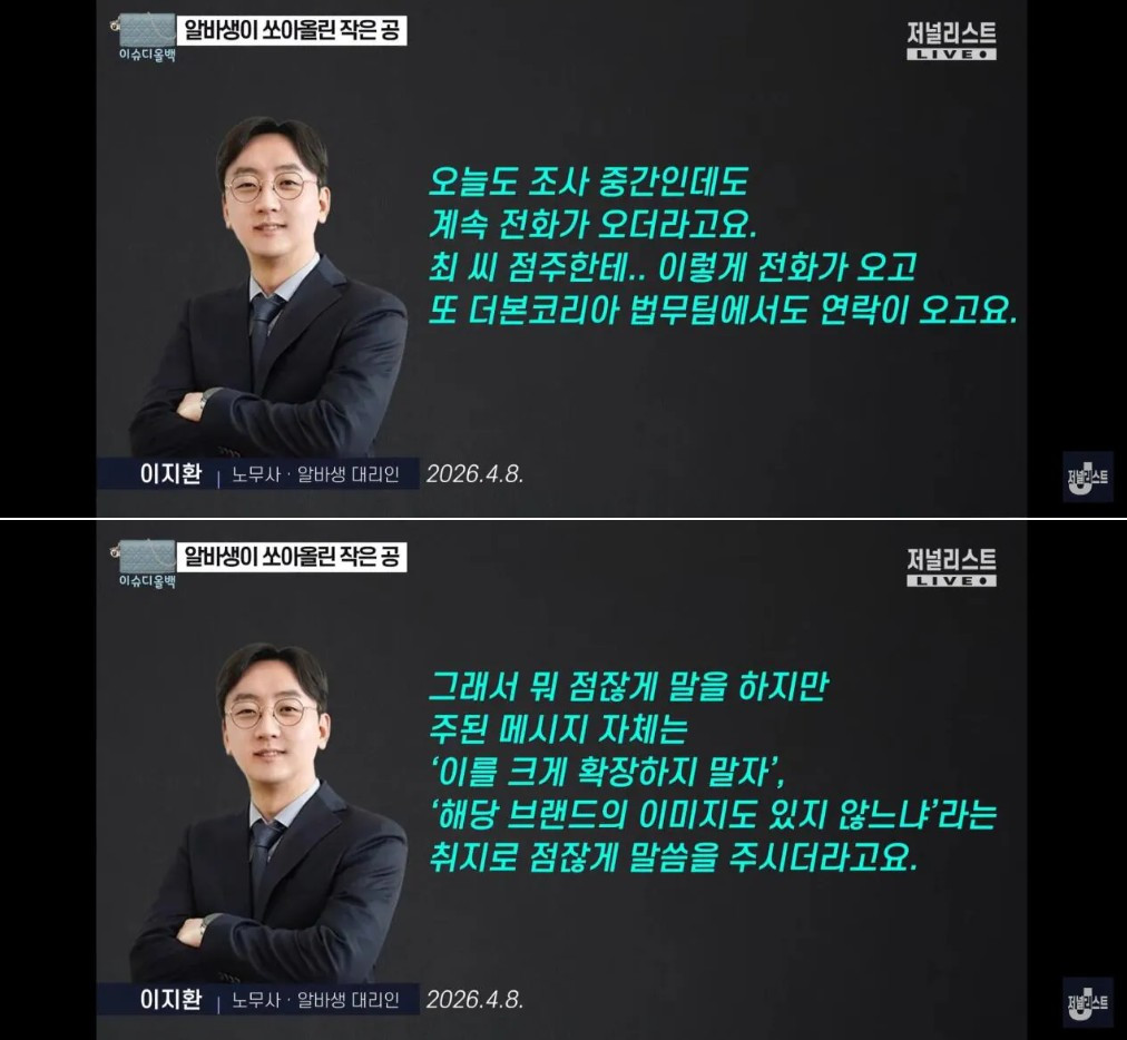 청주 빽다방 점주 결국 합의금반환과, 알바생에게 사과 조회 0 | 댓글 0건 가비슈포댄서 2시간전 합의금 550만원 점주가 피해학생에게 사과와 함께 550만원을 다시돌려줌 받은내역 +더본코리아에서 해당 가맹점 두곳을 영업정지시킴 + 청주 빽다방 사건 알바생 대리인이 점주와 더본코리아 법무팀에 받은 연락 0