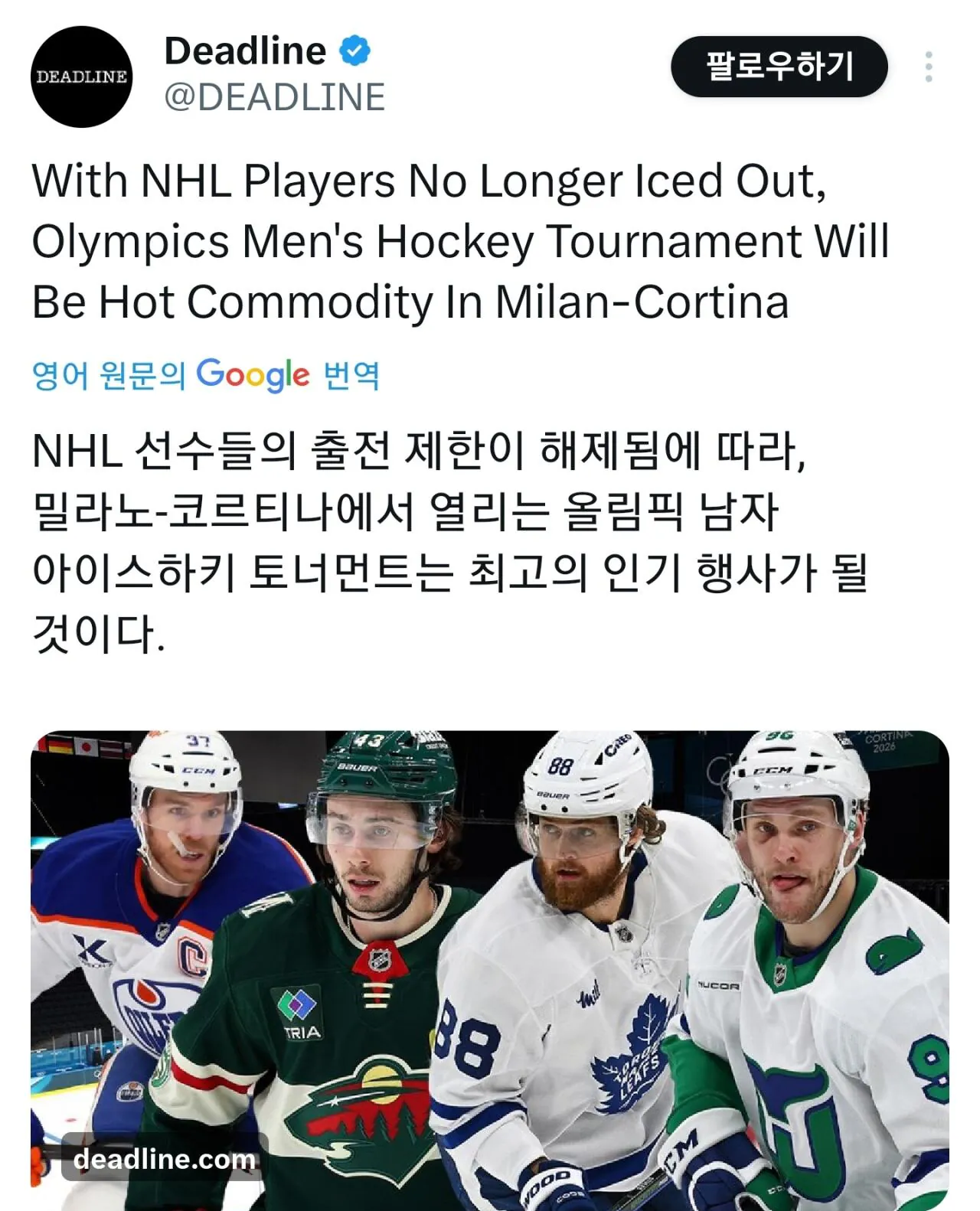 이번 동계올림픽 중 해외에서 관심이 집중되는 것 조회 0 | 댓글 0건 개장수11 2시간전 동계올림픽에서 시청률이 가장 잘 나왔던 종목"아이스하키"2010 밴쿠버 동계올림픽 남자 아이스하키 결승전은 캐나다 국민들에겐 가장 기억에 남는 하루였다고 할 정도.그리고2014년 소치 대회 이후 동계 올림픽에 불참했던 북미아이스하키리그(NHL) 선수들이 12년 만에 복귀함따라서따라서 아이스하키 Big 6 국가들이 올스타 라인업을 구성할 수 있게 됨.해외에선 NHL이 올림픽에 돌아왔다며 티켓 오지게 팔리고, 중계 관심도도 높아지는 중 0