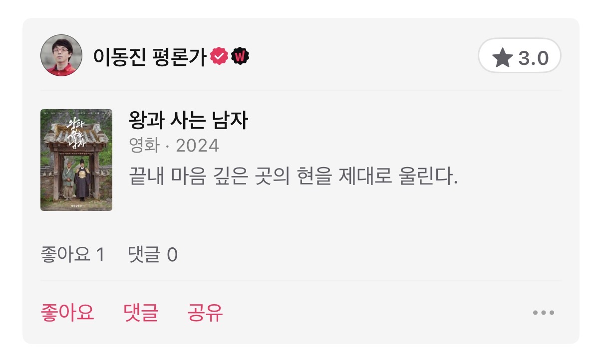 이동진 평론가 "왕과 사는 남자" 별점 및 한줄평