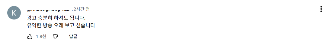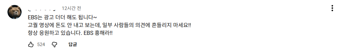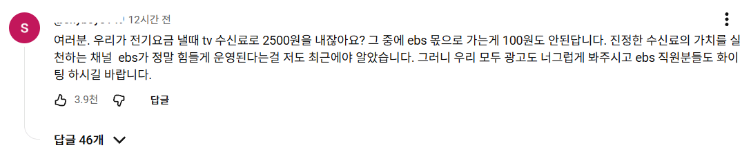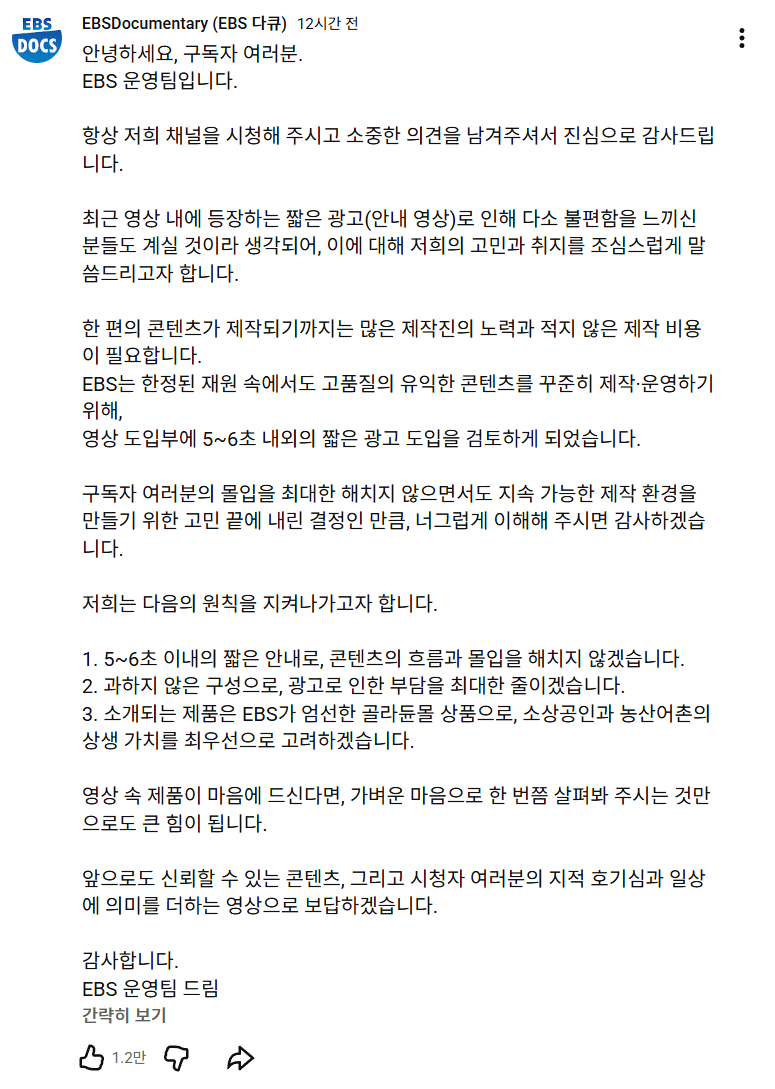 오늘자 EBS 다큐 운영팀이 유튜브 채널에 올린 공지 조회 0 | 댓글 0건 네이마르로 2시간전 재정 사정 때문에 5~6초짜리 광고 넣게된 점 양해바란다고 함 광고되는 제품은 소상공인하고 농산어촌을 우선적으로 고려하겠다고 함 댓글은 전반적으로 호의적인 분위기 0