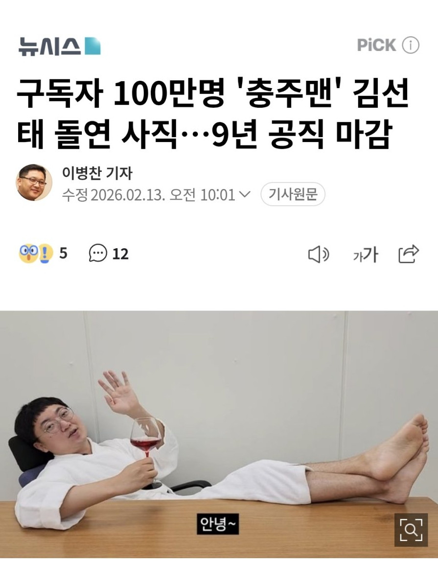 구독자 100만명 '충주맨' 김선태 돌연 사직…9년 공직 마감 :: 공감언론 뉴시스 ::