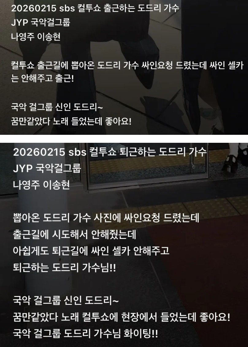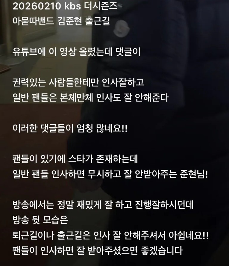 개그맨 김준현 저격한 인스타 글 조회 0 | 댓글 0건 가지마라 1시간전 아래는 다른 영상의 다른 가수 관련 글 김준현 평소 인사 받아주는 모습 맨 위 영상도 보면 목례하면서 "안녕하세요" 했음 연예인들 참 피곤할듯.. 0