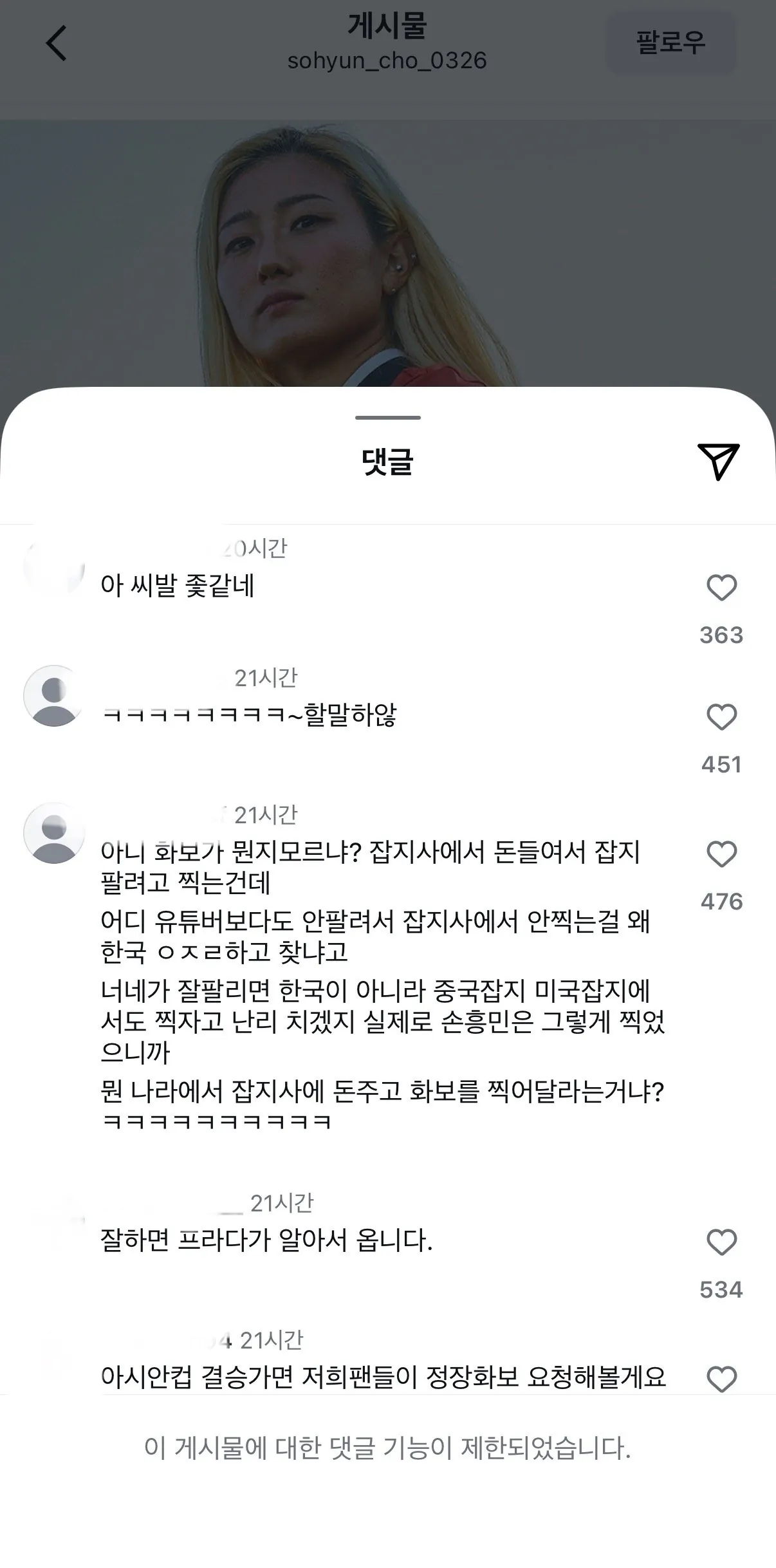 프라다녀 인스타 현재 상황 조회 0 | 댓글 0건 돌잔치앤가반나 10시간전 댓글에 욕박히니까 막아놓고 인스타 스토리 계속 조짐 ㅋㅋㅋㅋㅋㅋ 역시 일류다 니네가 뭘 할 수 있는데??? 인스타 댓글이 저런 이유는 아래 링크 참조/talk/article_view?indexno=1960675&bbs_id=10&cate_id=0 0