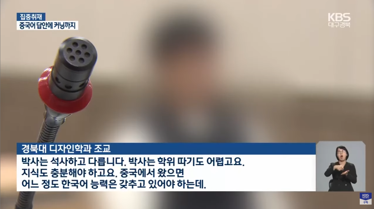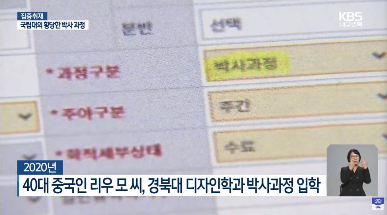 2020년 경북대학교 디자인학과 박사 과정에 입학한 40대 중국인 리우 모 씨. 리우 씨는 2년간 36학점을 A 이상 우수한 성적으로 이수했습니다.