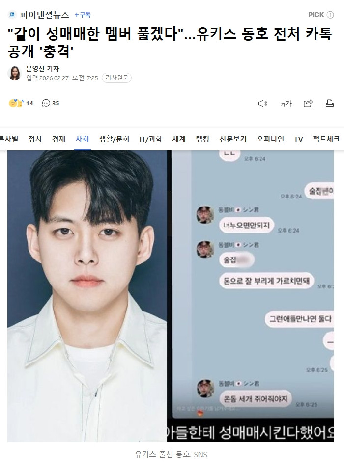 "같이 성매매한 멤버 풀겠다"…유키스 동호 전처 카톡 공개 조회 0 | 댓글 0건 드가쥬아 1시간전 "같이 성매매한 멤버 풀겠다"…유키스 동호 전처 카톡 공개 '충격' - 파이낸셜뉴스 0