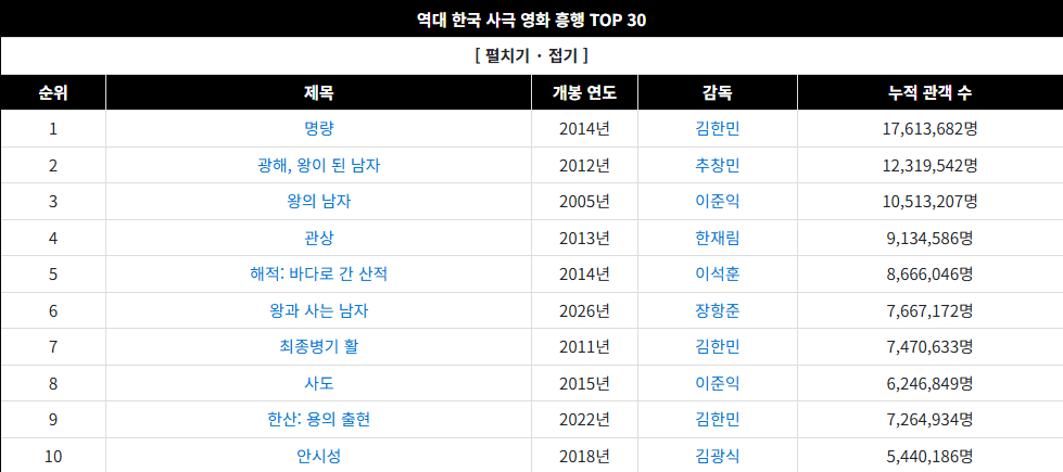 왕사남 800만 돌파 기념 역대 사극 흥행 TOP 10 조회 0 | 댓글 0건 개장수11 3시간전 어제 성적으로 이미 "최종병기 활"은 따돌렸고아마 내일~모레 "해적: 바다로 간 산적"을 따돌리고역대 사극영화 5위에 안착할 것으로 추정됨. 최종적으로는 "왕의 남자"를 추월해서 역대 3위혹은"광해, 왕이 된 남자"를 따돌리고 역대 2위도 가능 + 2월에 개봉한 한국 영화 중 역대 1위도 가능(현재 1위는 1191만의 파묘. 2위는 태극기 휘날리며.) 0