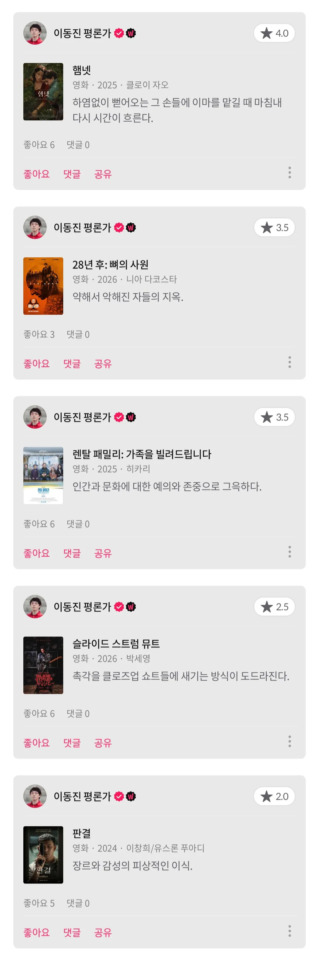 이동진 평론가 이번주 신작 영화 별점 조회 0 | 댓글 0건 대박노 4시간전 햄넷 (클로이 자오) 28년 후: 뼈의 사원 (니아 다코스타) 렌탈 패밀리: 가족을 빌려드립니다 (히카리) 슬라이드 스트럼 뮤트 (박세영) 판결 (이창희) 0