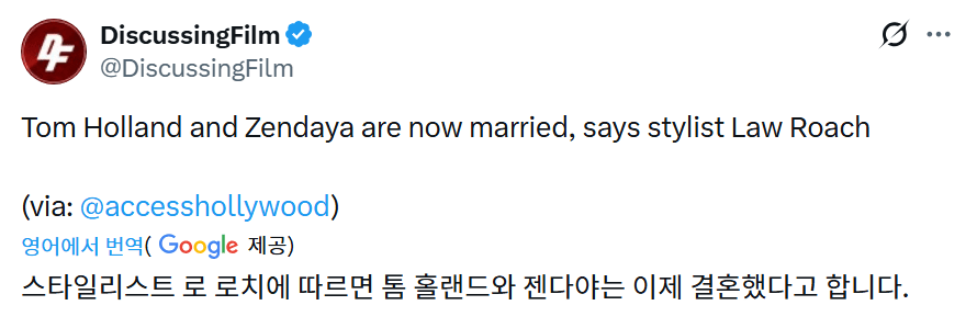 스파이더맨 톰 홀랜드 & 젠데이아 커플 결혼 조회 0 | 댓글 0건 가비슈포댄서 3시간전 젠데이아의 최측근 스타일리스트가 조금 전 인터뷰에서 두 사람이 이미 결혼식을 했다고 밝힘 인터뷰 출처 0