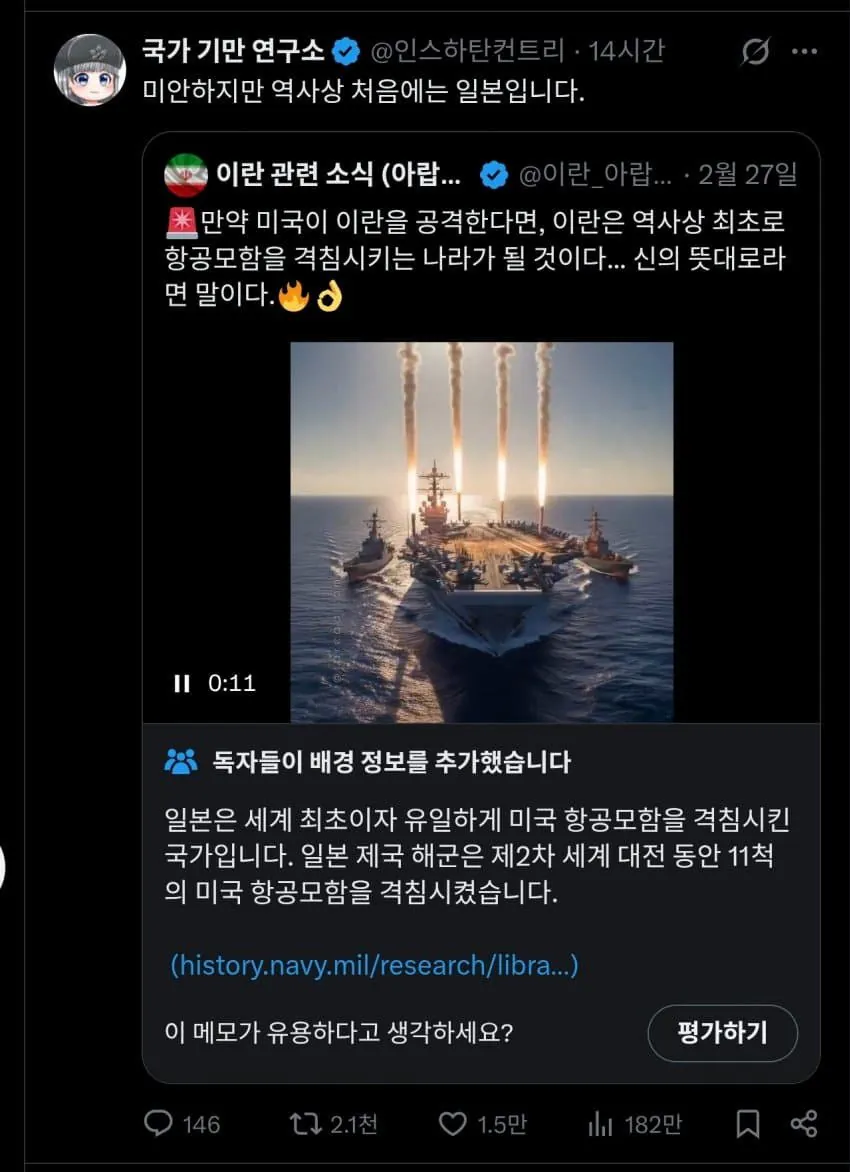 이란 : 우리가 미 항공모함 격추하는 최초의 나라가 될것