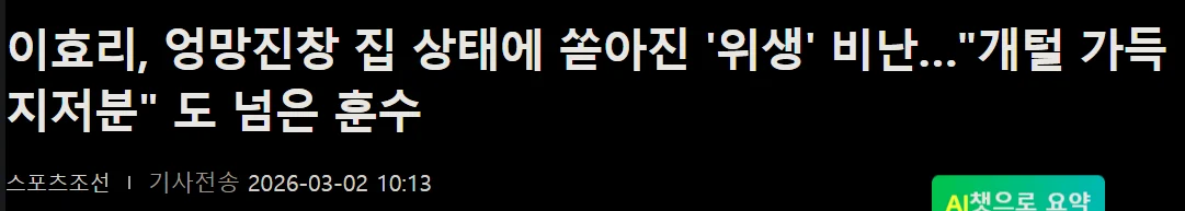 이효리, 엉망진창 집 상태에 쏟아진 ‘위생‘ 비난 조회 0 | 댓글 0건 갓파 3시간전 https://news.nate.com/view/20260302n05205 진짜 엉망진창 집 상태가 뭔지 보여줘? 0