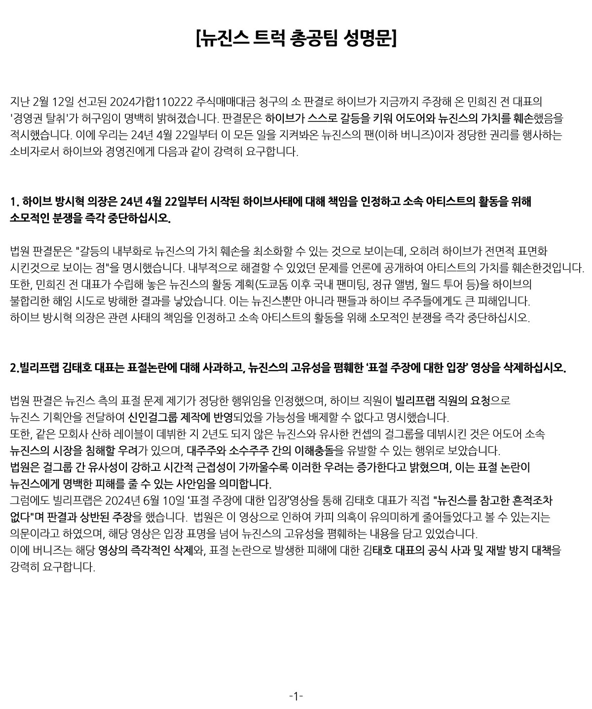 성명문 발표하고 하이브 앞 트럭총공 시작한 뉴진스 팬덤