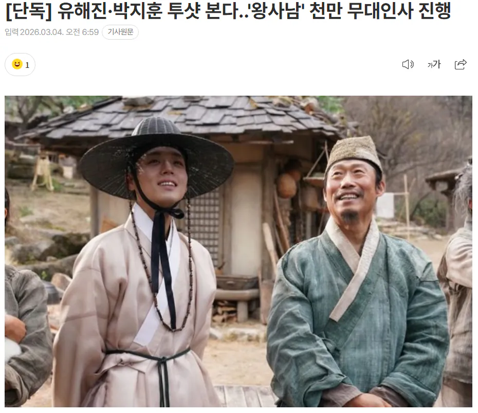 4일 OSEN 취재 결과, 영화 '왕과 사는 남자'(이하 왕사남)의 장항준 감독, 주연 배우 유해진, 박지훈 등은 천만 관객들의 사랑에 보답하기 위해서 오는 3월 중순 특별한 '땡큐 무대인사'를 하기로 마음을 모았다. 유해진과 박지훈 외에도 유지태, 전미도, 김민 등 작품에서 활약한 배우들이 모두 참여하기 위해 날짜를 조율하고 있는 것으로 알려졌다.
