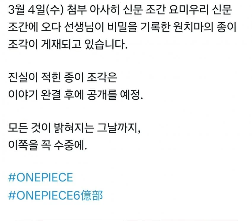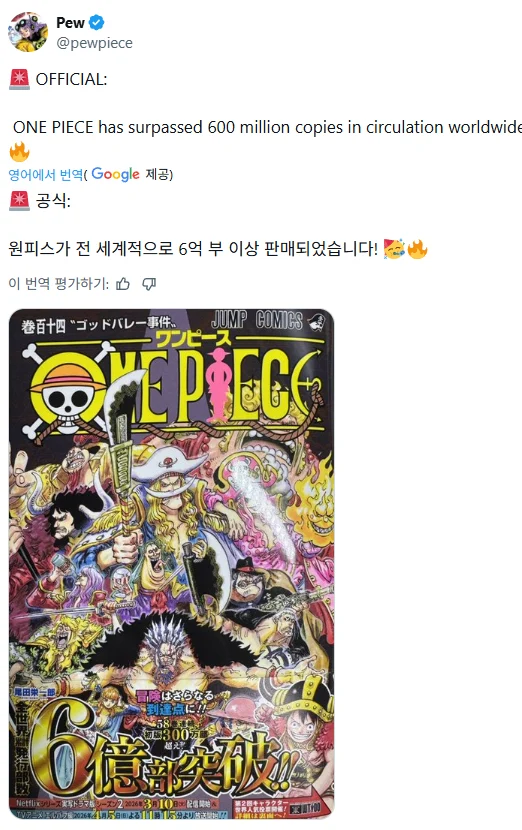 원피스가 누적 판매부수 6억부에 돌파해서(일본: 4억 5천, 해외: 1억 5천)