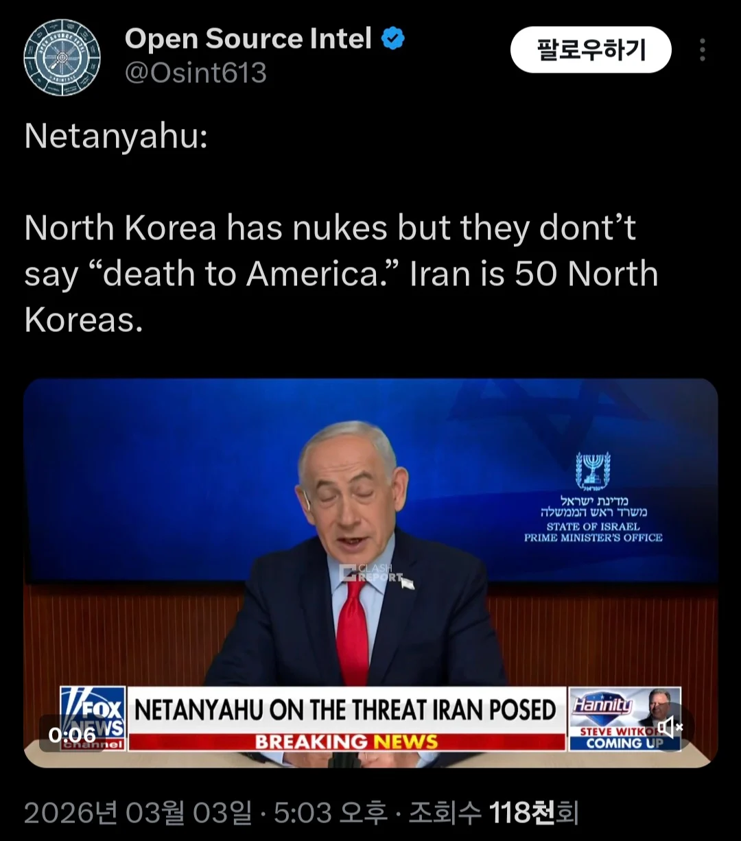 이스라엘 총리 : 북한은 핵무기 있어도 됨 조회 0 | 댓글 0건 가지마라 2시간전 북한은 "미국 죽어라!"라고 말안하거든 이란은 북한 50개만큼 위험함 이란 50분의 1이랑 지랄하고 있는 우린 뭐가돼냐 씹련아 0