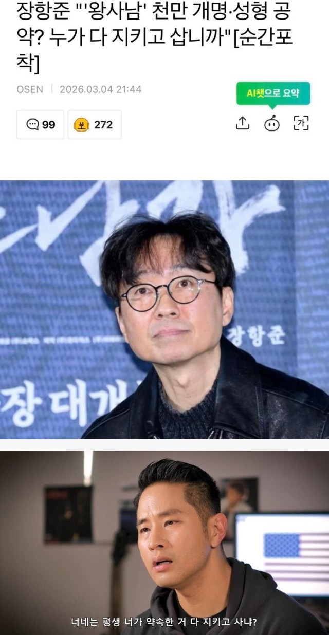 장항준 감독 "너희는 약속 다 지키냐?" 조회 0 | 댓글 0건 개장수11 3시간전 https://www.chosun.com/entertainments/broadcast/2026/03/04/HEZWCNRWG5RTCMDFG5STKMRZGE/ 스티브장 ㅋㅋ 0