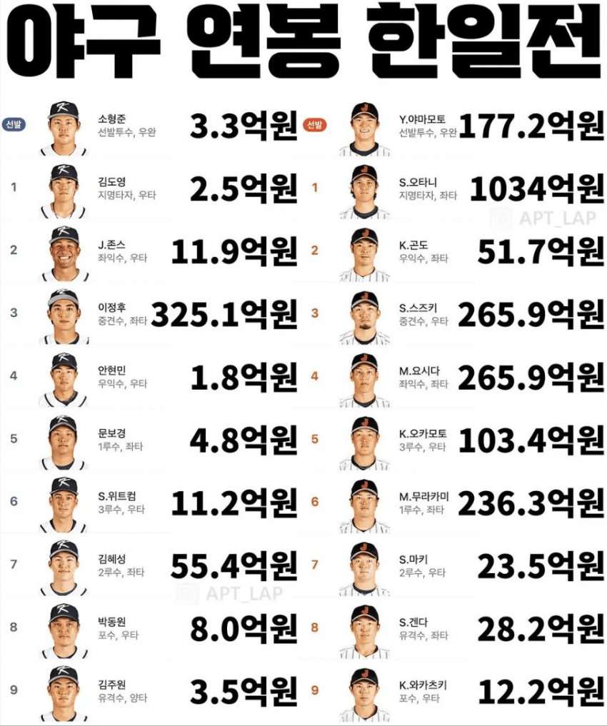 WBC 한국vs일본 선수들 연봉 비교