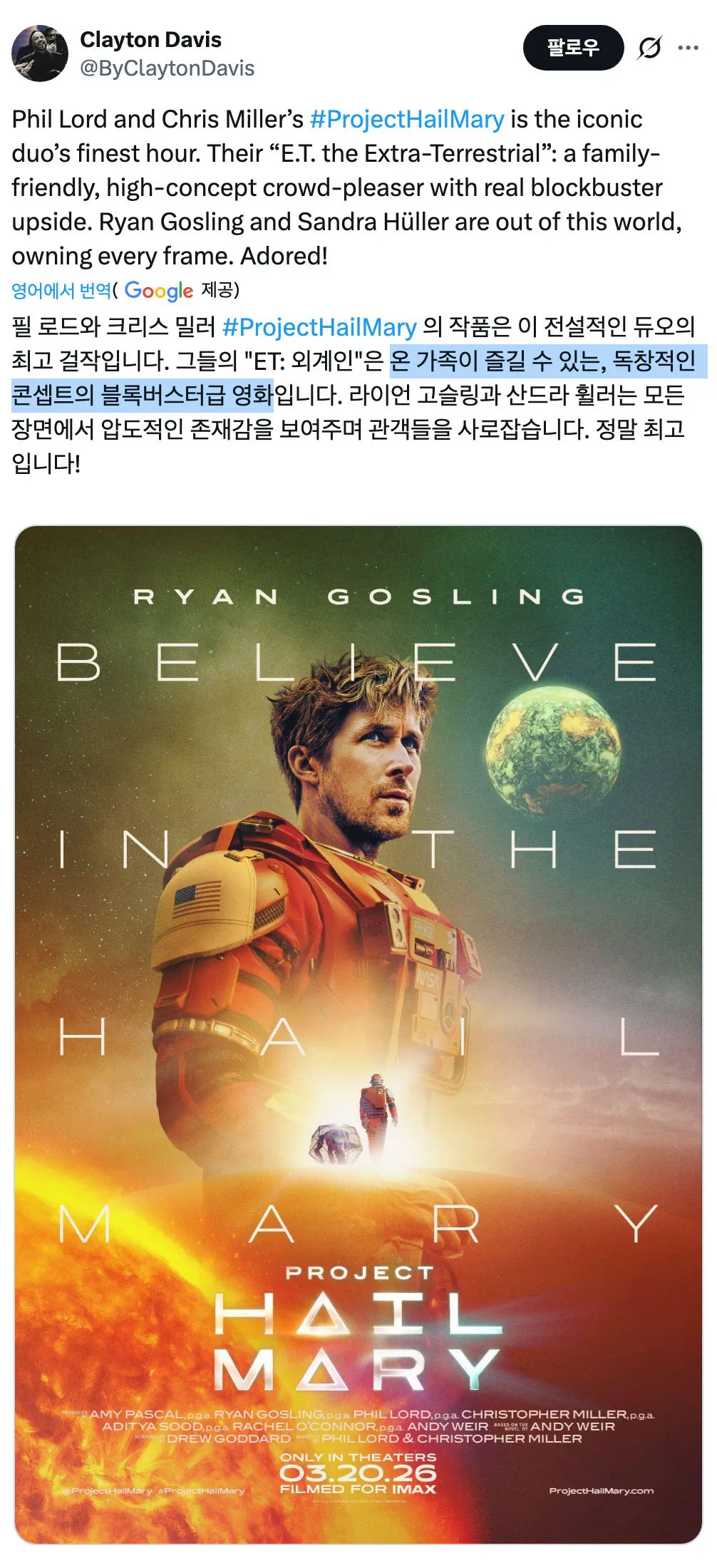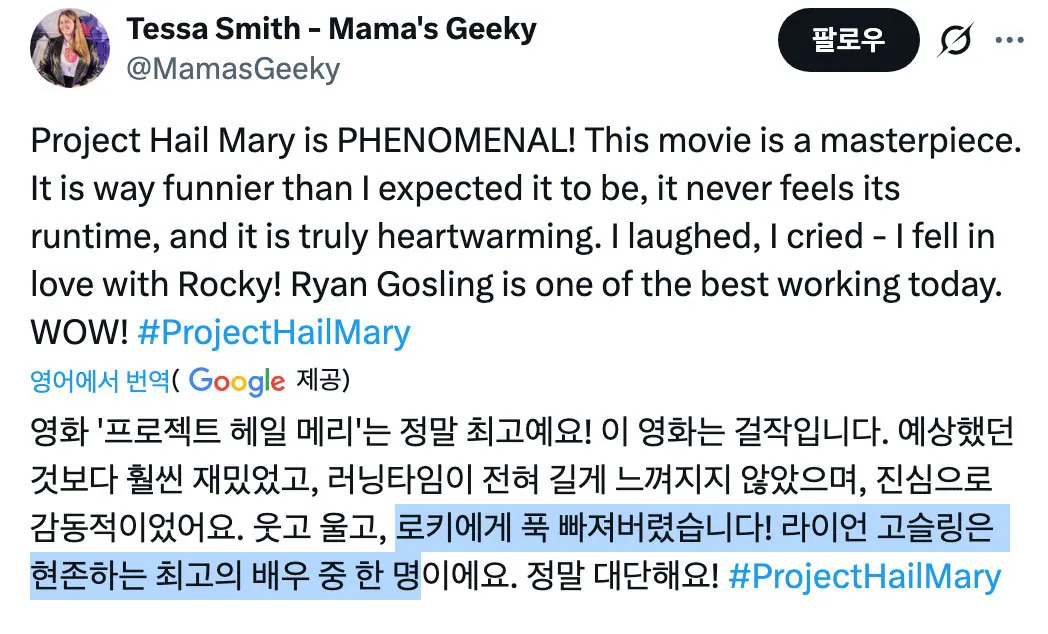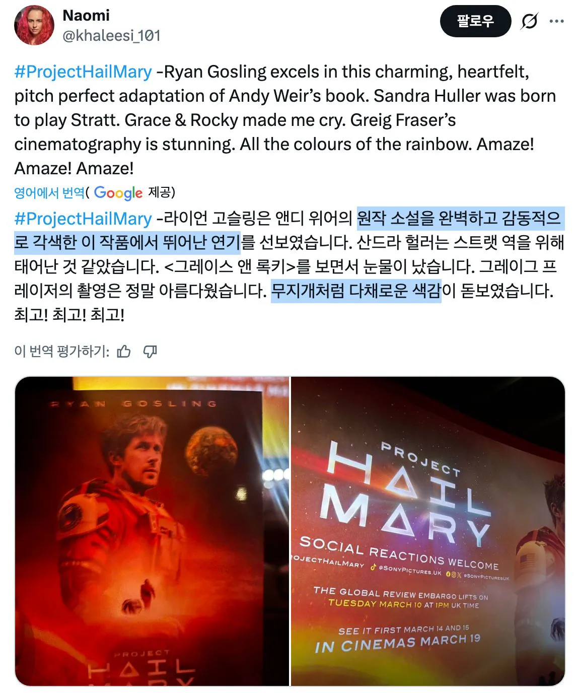 <프로젝트 헤일메리> 북미 첫 시사 반응