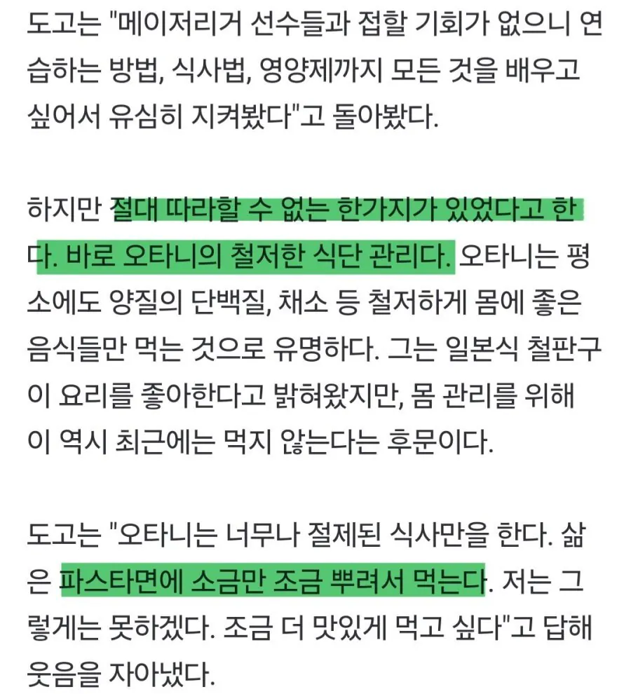 충격적인 오타니의 식단 관리 수준 조회 0 | 댓글 0건 감정괴물 2시간전 "오타니 선배, 파스타면에 소금만 뿌려 먹어" WBC 우승 멤버도 깜짝 놀란 뒷 이야기 - 스포츠조선 파스타면에 소금만 조금 뿌려먹기 이정도면 스님도 놀랄듯 0