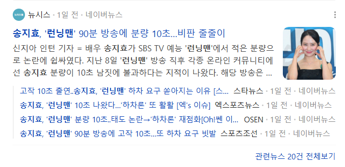 분량 논란 송지효.. 저저번주 런닝맨 카드게임 분량 조회 0 | 댓글 0건 대박노 2시간전 분량 논란으로 기사 수십개 나오고 있는 송지효 저번주만 문제있는게 아님. 저저번주에 한 눈치카드게임인데 이게 런닝맨 90분중 35분정도 방영함. 35분중에 분량은 저 파산당하는 과정이 대부분이고 나머진 오디오 잠깐잠깐이랑 다른멤버들이랑 같이 화면 잠깐 잡히는게 끝임. 요즘보면 송지효랑 같은팀되면 다른 멤버들도 커버못칠정도임 0