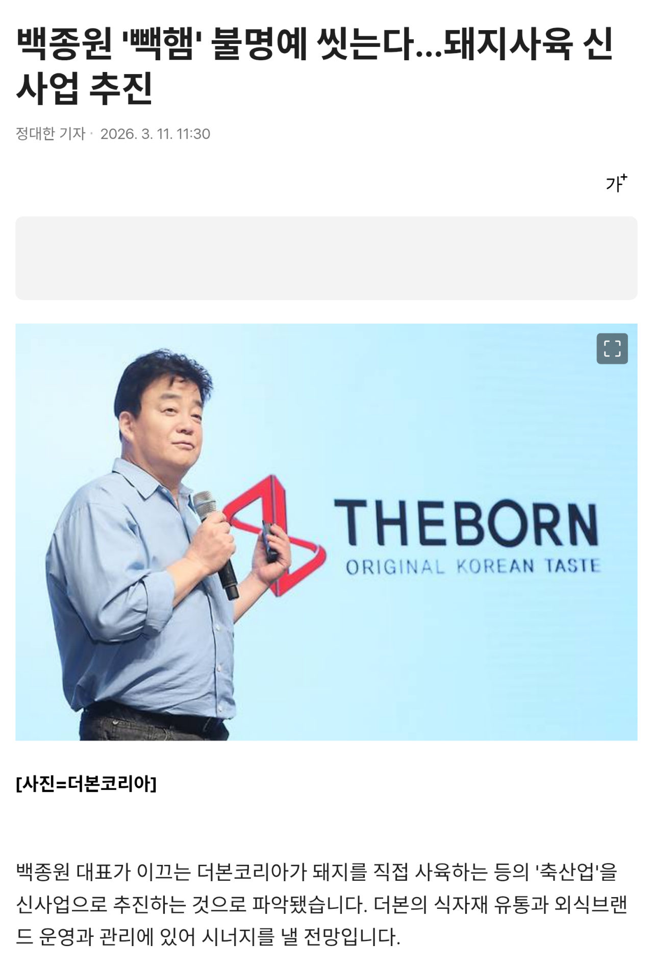 백종원 빽햄 불명예 씻는다.. 돼지 신사업 추진 조회 0 | 댓글 0건 개장수11 3시간전 이제 돼지 사육까지..진짜 돼지 사랑하시는 백선생님 https://biz.sbs.co.kr/article/20000296583?division=NAVER 0