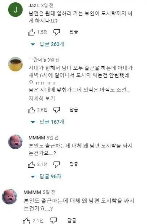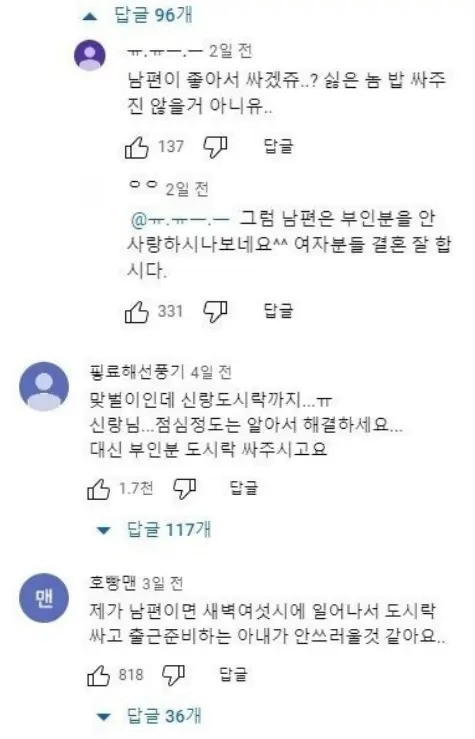 새벽에 남편 도시락 싸주는 영상 올리면 받는 댓글(feat.한녀수준)
