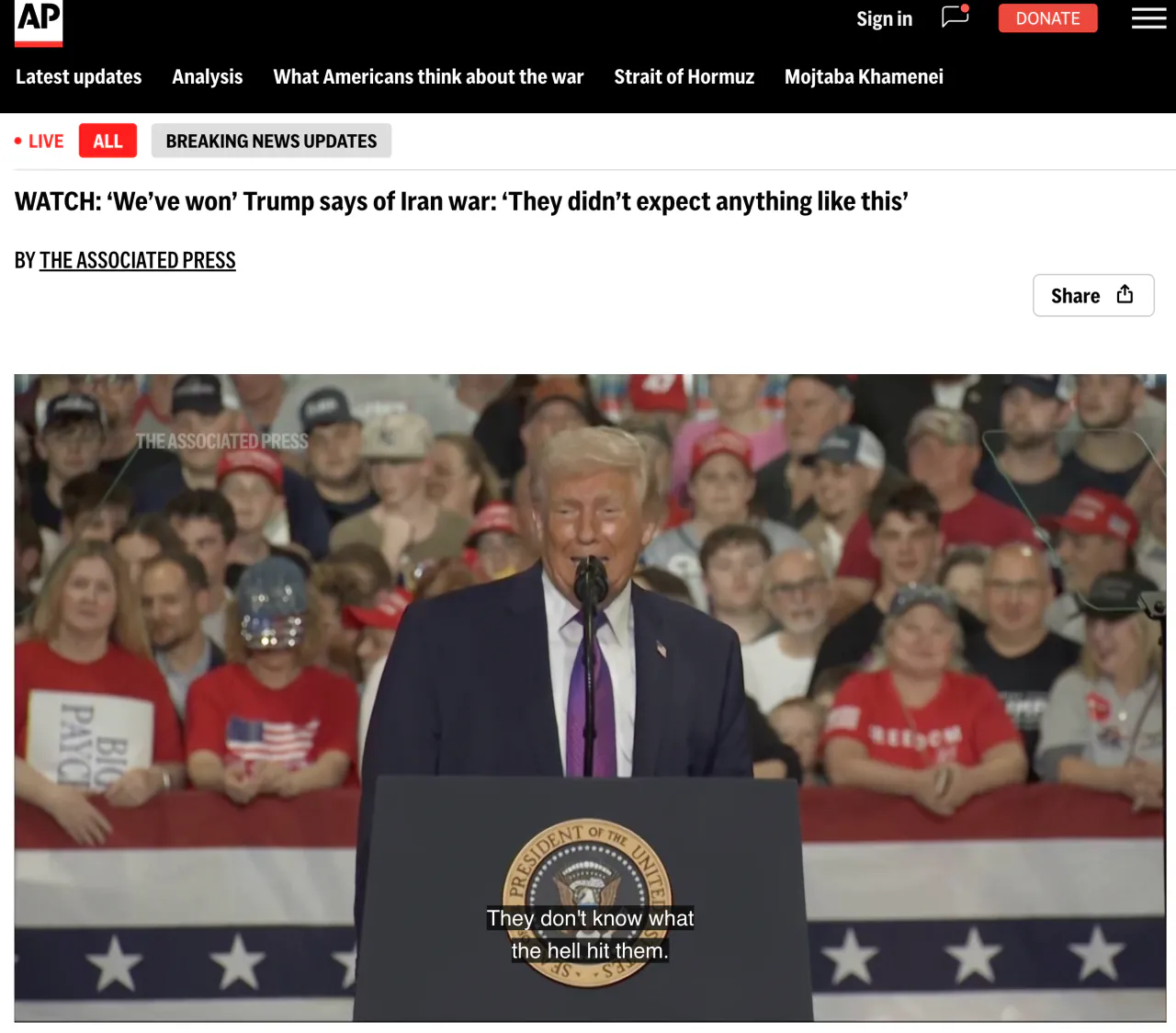 [헤브론(켄터키)=AP/외신 종합] 도널드 트럼프 미국 대통령이 이란과의 전쟁(작전명: 에픽 퓨리)에 대해 사실상의 승리를 선언했다.