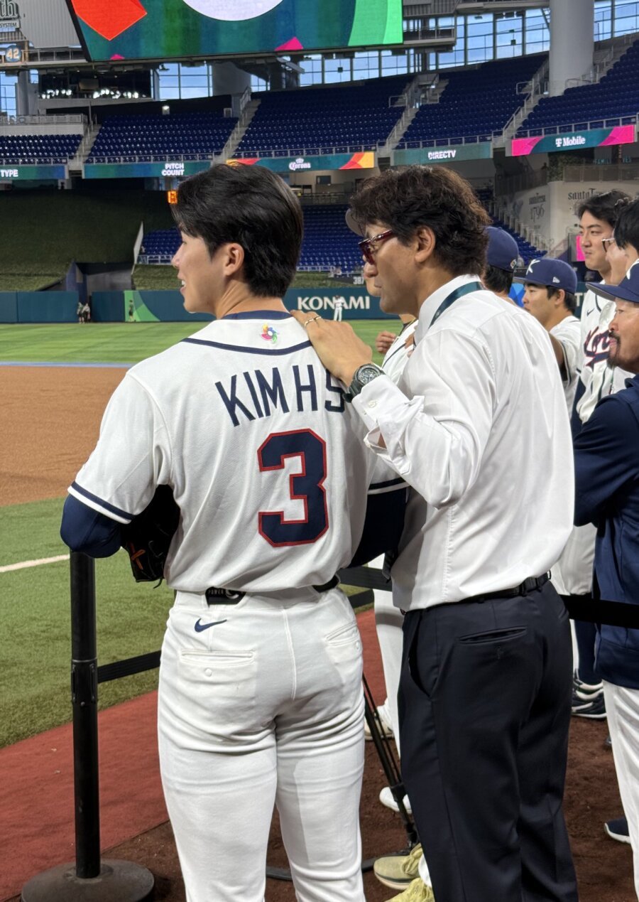 김혜성에게 뭔가 얘기하는 박찬호