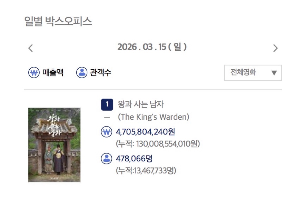 누적 관객수 1346만명으로 역대 한국 영화 top5가 된 왕과 사는 남자
