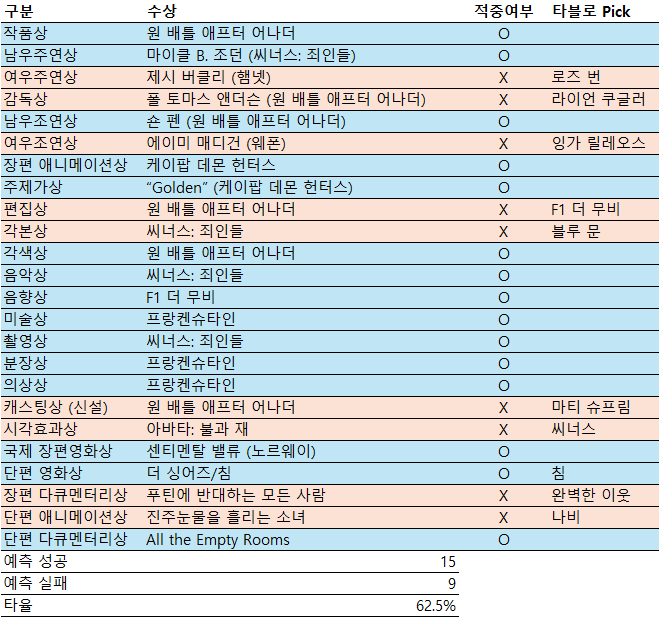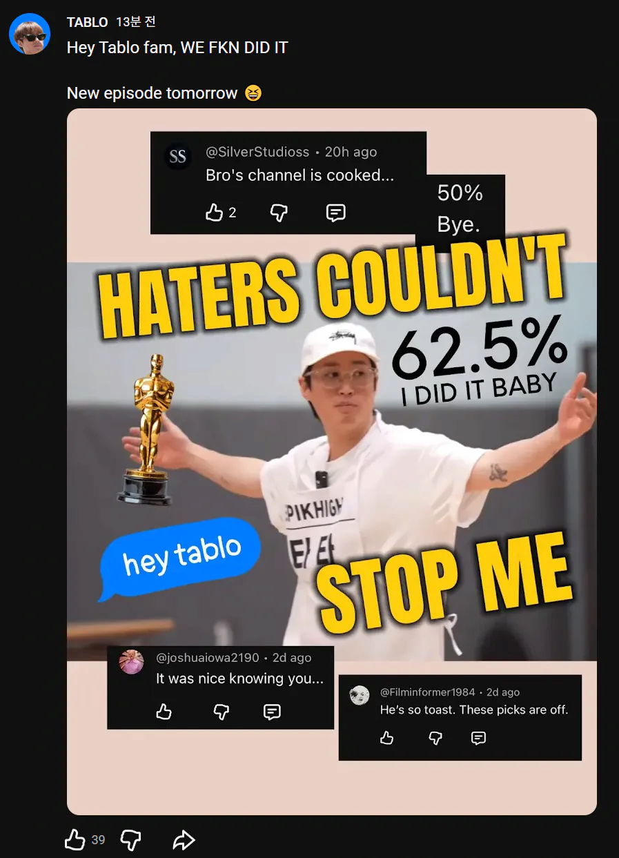 타블로가 채널을 걸었던 오스카 예측 결과 조회 0 | 댓글 0건 드가쥬아 2시간전 이전에 타블로는 2026년 오스카 수상작을 예측하고 절반이상 못맞추면 채널 폭파하겠다고 공약함 결과는 ㅋㅋ 아슬아슬하게 6할대 적중률로 채널 지키는데 성공함 ㅋㅋㅋㅋㅋㅋ타블로 반응 ㅋㅋㅋㅋ 0