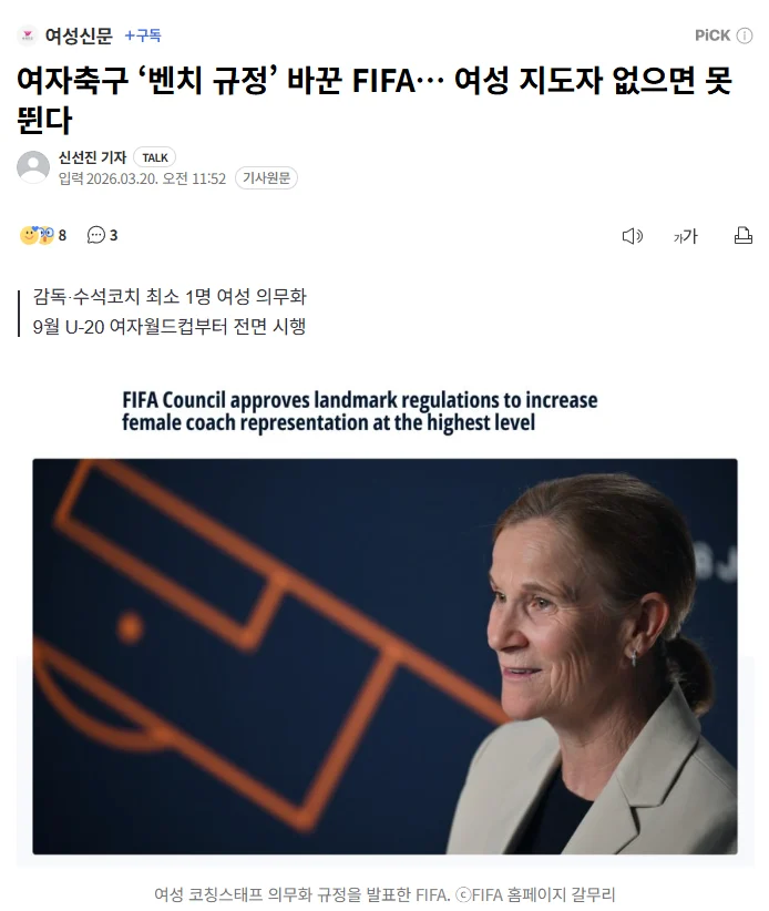FIFA 올 9월부터 여성할당제 시행 조회 0 | 댓글 0건 더한마음 3시간전 올 9월부터 여자축구에는 반드시 '여성지도자'가 포함되어야 출전이 가능함. 여자축구 ‘벤치 규정’ 바꾼 FIFA… 여성 지도자 없으면 못 뛴다 0