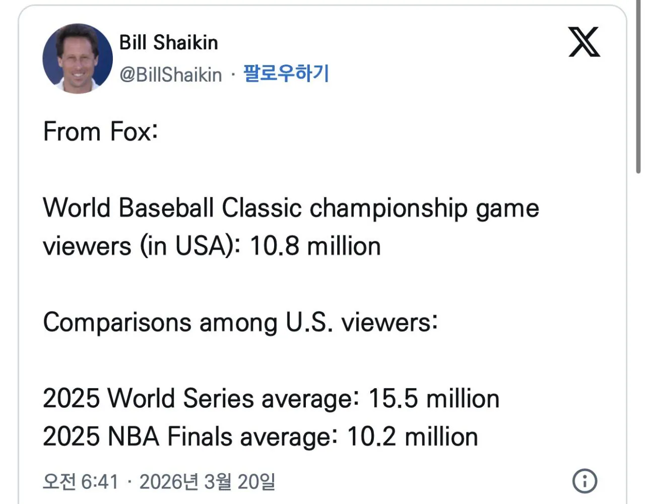 이번에 미국서 초대박난 WBC 결승 시청률 조회 0 | 댓글 0건 강승 2시간전 평균 1078만 최고 시청자 수 1200만 이상 지난 2025년 NBA 파이널보다 시청률 잘나옴 이제 이벤트 대회라고 치부하기엔 대회가 좀 커졌음 0
