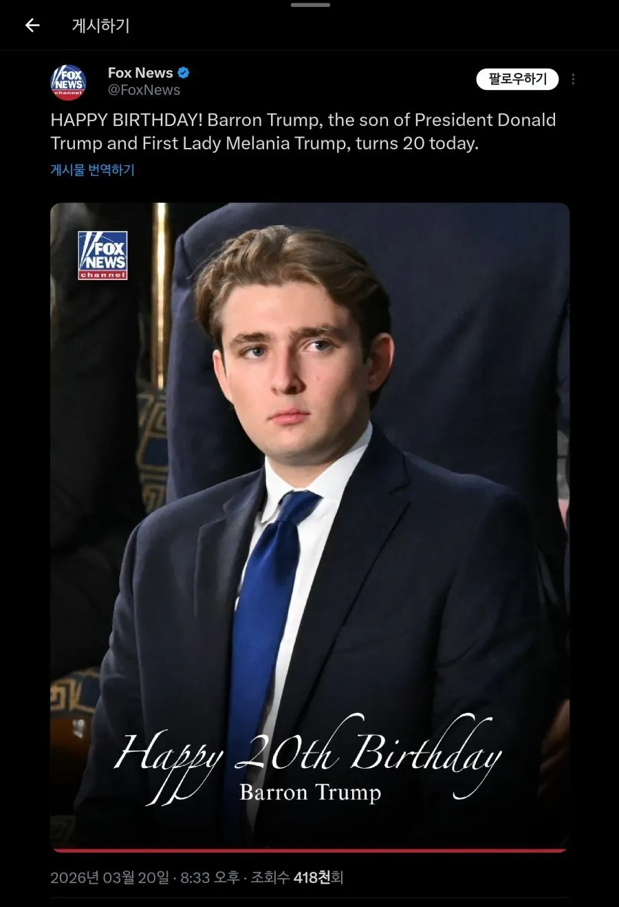 최근 미국 폭스뉴스 SNS 근황 조회 0 | 댓글 0건 가자가자가자고 2시간전 '오늘은 트럼프 대통령의 아들 배런 트럼프의 20번째 생일입니다 경*축' 참고로 합성이나 AI 절대 아님 0