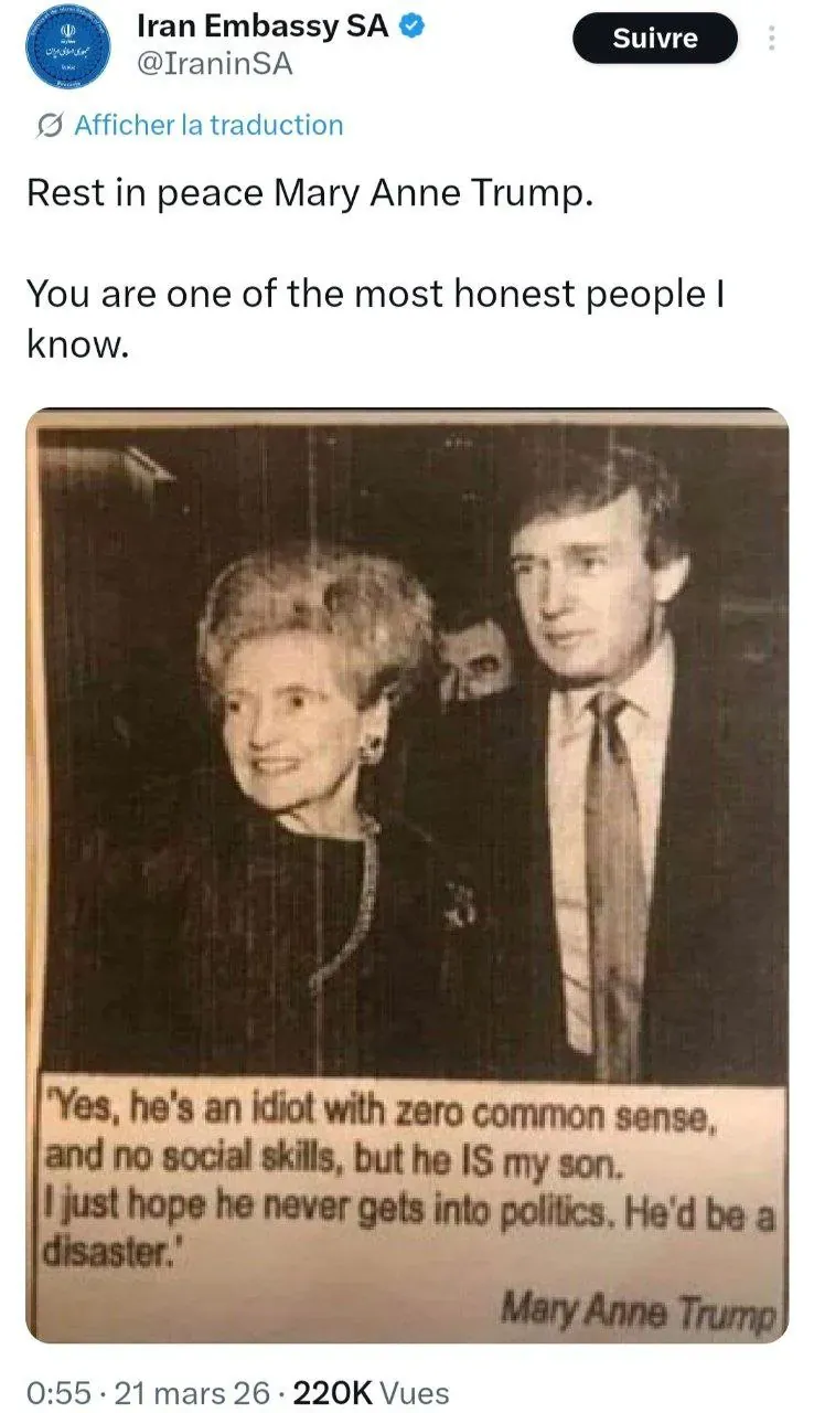 "맞아요, 그는 상식이란게 없는 바보고, 사회적 기술이 없습니다. 그러나 그는 제 아들입니다. 나는 단지 그가 정치에 절대 뛰어들지 않기를 바랍니다. 그건 재앙일겁니다."