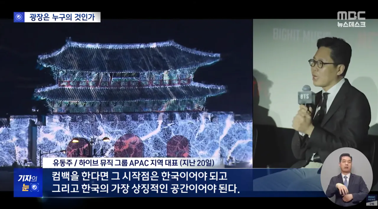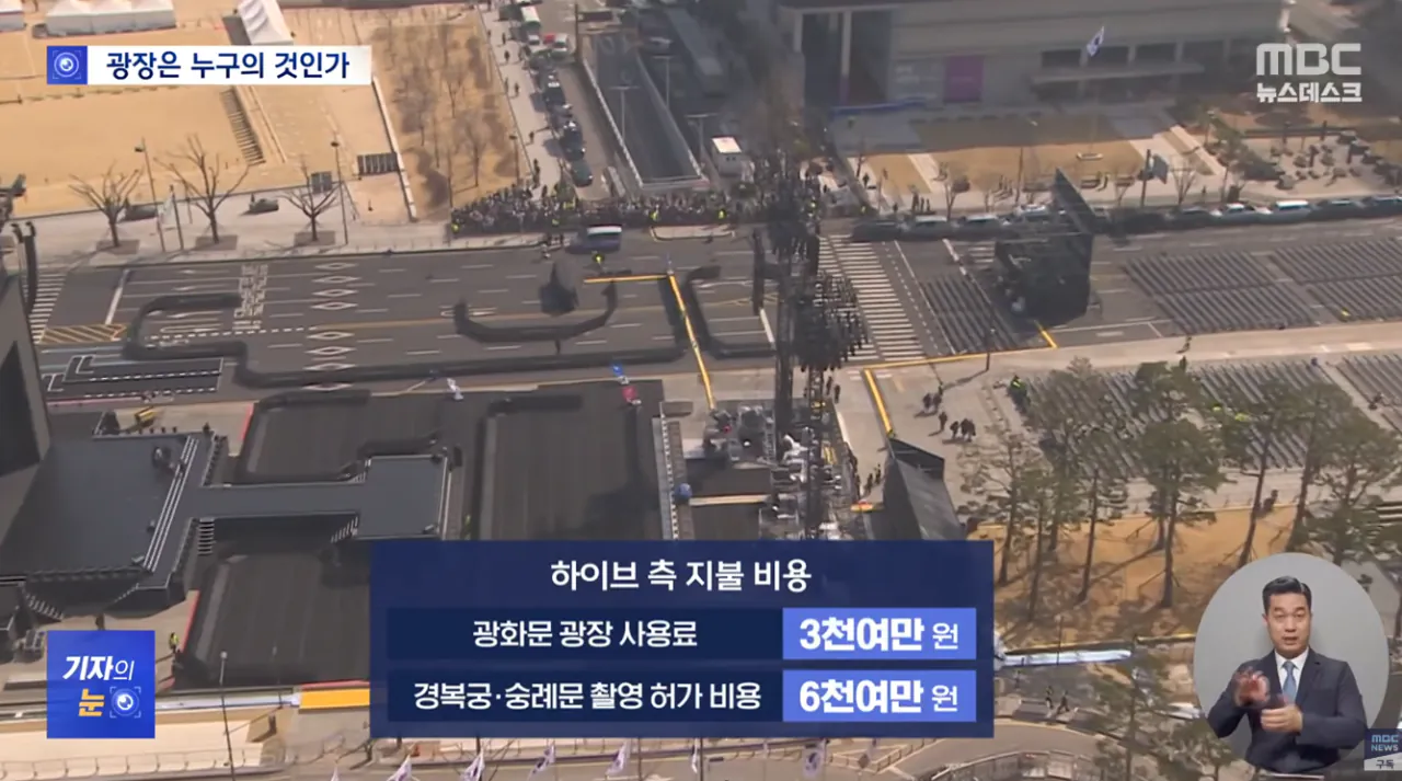 - 하이브가 광장 사용료와 경복궁/숭례문 촬영 허가 비용으로 낸 돈은 9천만원이 전부, 대형 공간을 빌리는 비용 치곤 사실상 무료