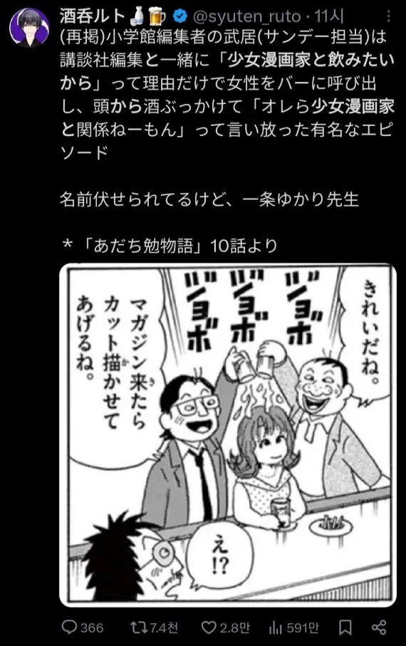 여자 작가들을 불러 연재 시켜 줄까? 라며 머리에 술을 붓고 희롱하며 놀았다는 아다치미츠루의 친형