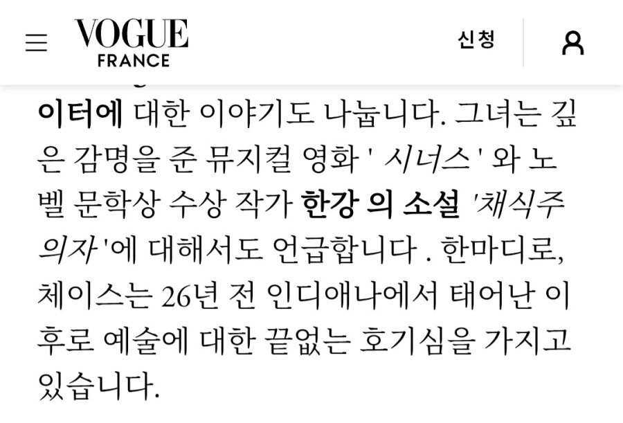 케이팝을 좋아하고, 한강 소설을 읽는 헐리웃 여배우 조회 0 | 댓글 0건 가자가자가자고 3시간전 체이스 인피니티 ('원배틀 애프터 어나더'의 디카프리오 딸 역할 배우) 보그 프랑스판 인터뷰 중에서. 데뷔전엔 케이팝 커버도 했음. 0