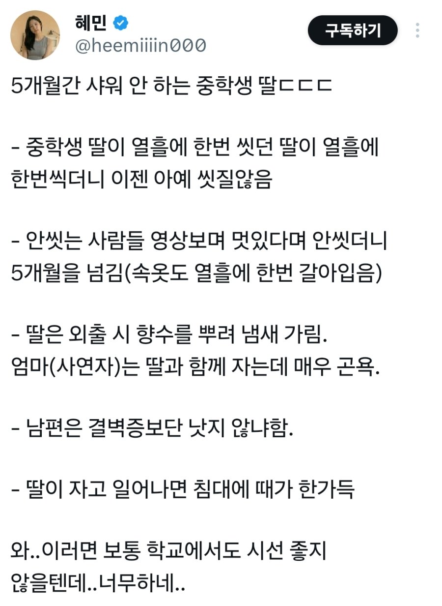 무려 5개월간 샤워 안하는 중학생 딸