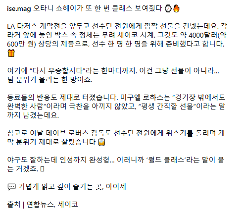 선수단 전원에게 시계 선물한 오타니 조회 0 | 댓글 0건 가지마라 3시간전 로스터 26인이면 1억 5000만원 코칭스태프 전체라면 50명 3억원 ㄷㄷㄷ 참고로 오타니 연봉은 30억원, 연봉외 수입은 1872억 0