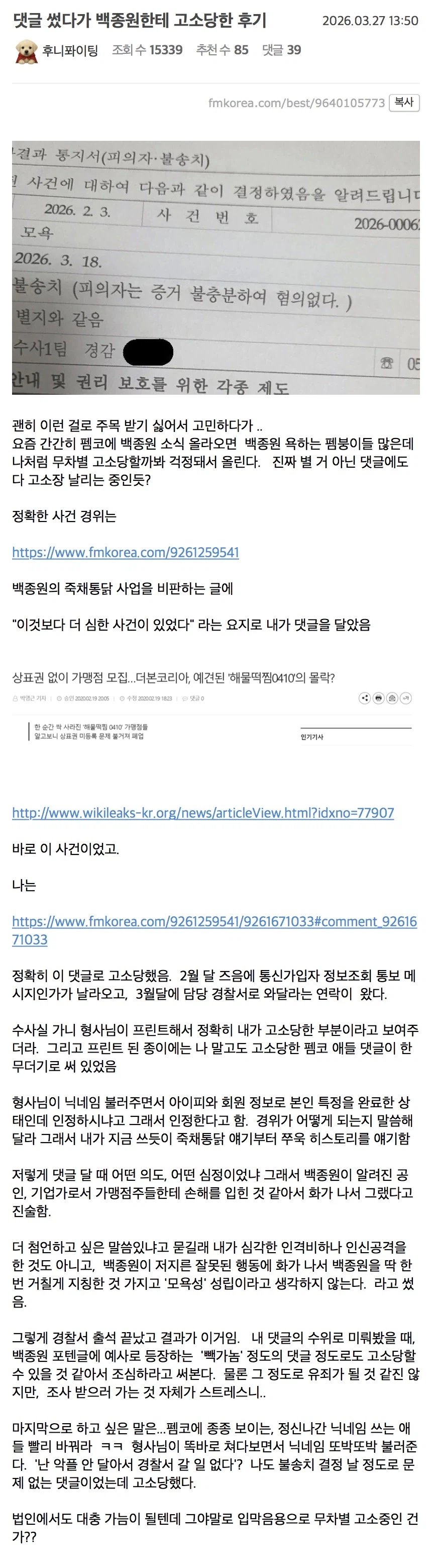 백종원 욕했다고 고소당한 사람 후기