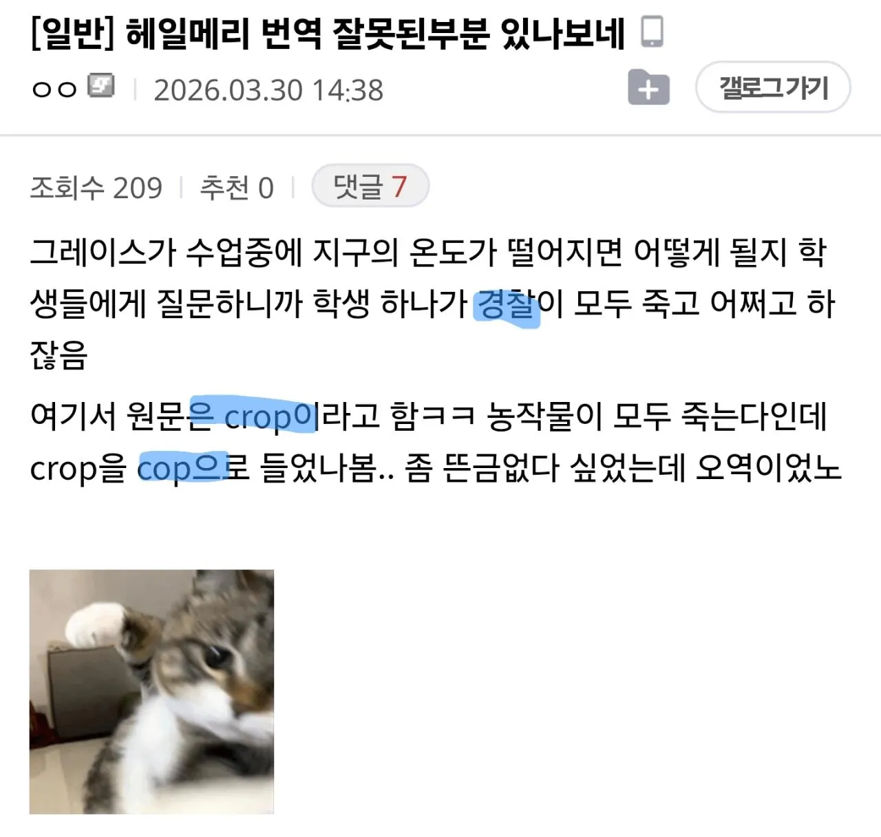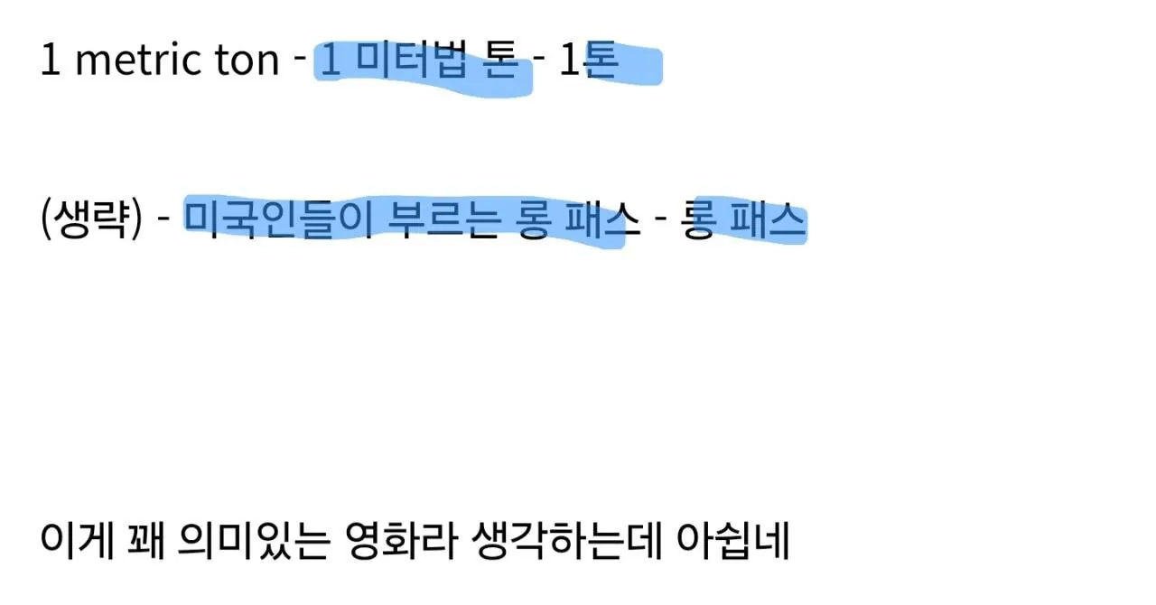 스포x) 황석희 번역가, <프로젝트 헤일메리> 오역 정리 조회 0 | 댓글 0건 드가쥬아 2시간전 원문 crop 정역 농작물 오역 경찰(cop) 원문 기억안남 정역 죽은 것 포함 4개 / 죽은 것 제외 3개 오역 죽은 것 포함 3개 원문 1 metric ton 정역 1 미터법 톤 오역 1 톤 참고로 "톤"에는 숏 톤, 롱 톤, 미터법 톤 이렇게 3가지가 있음. 놀랍게도 미국인들은 미터법 톤을 안 쓰고 숏/롱 톤을 쓰지만ㅋㅋㅋ 작중에선 미터법 톤을 씀. 0