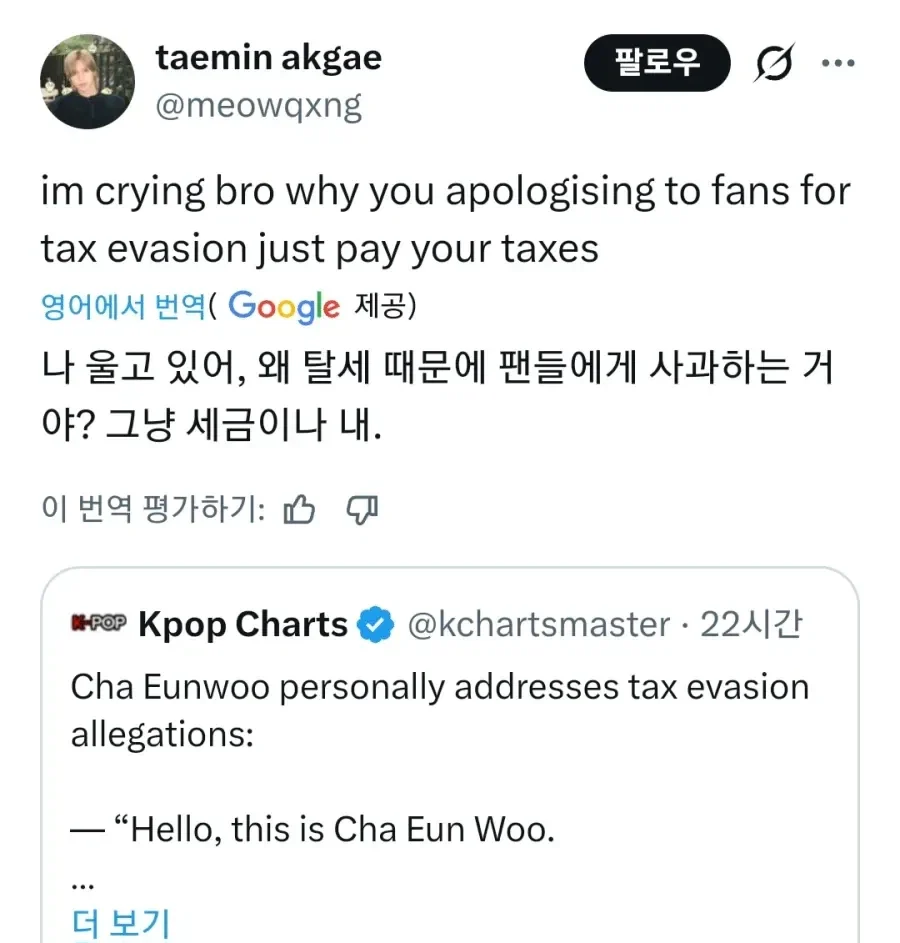 세금내는거랑 팬들에게 사과하는거랑 뭔상관이냐 하는중