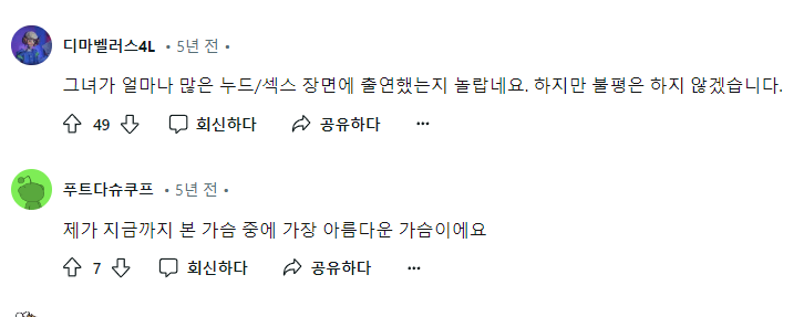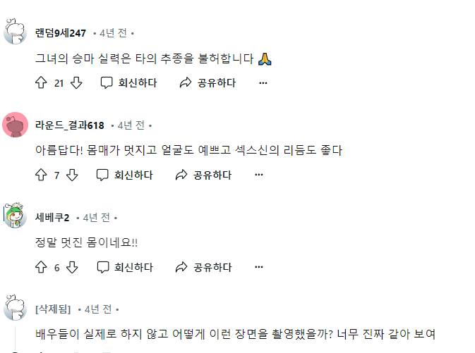 필모그래피에서 엄청나게 많은 노출씬 중에 임팩트가 가장 쎄서인지 해외 커뮤에서는 많이 언급되는 베드신인데 국내에서는 VOD 수입되면서 편집된 장면.
