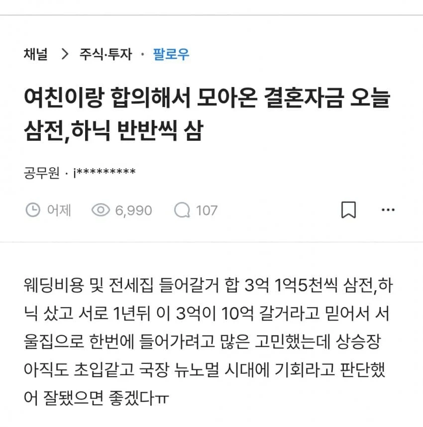 결혼자금으로 삼전, 하이닉스 반반씩 삼