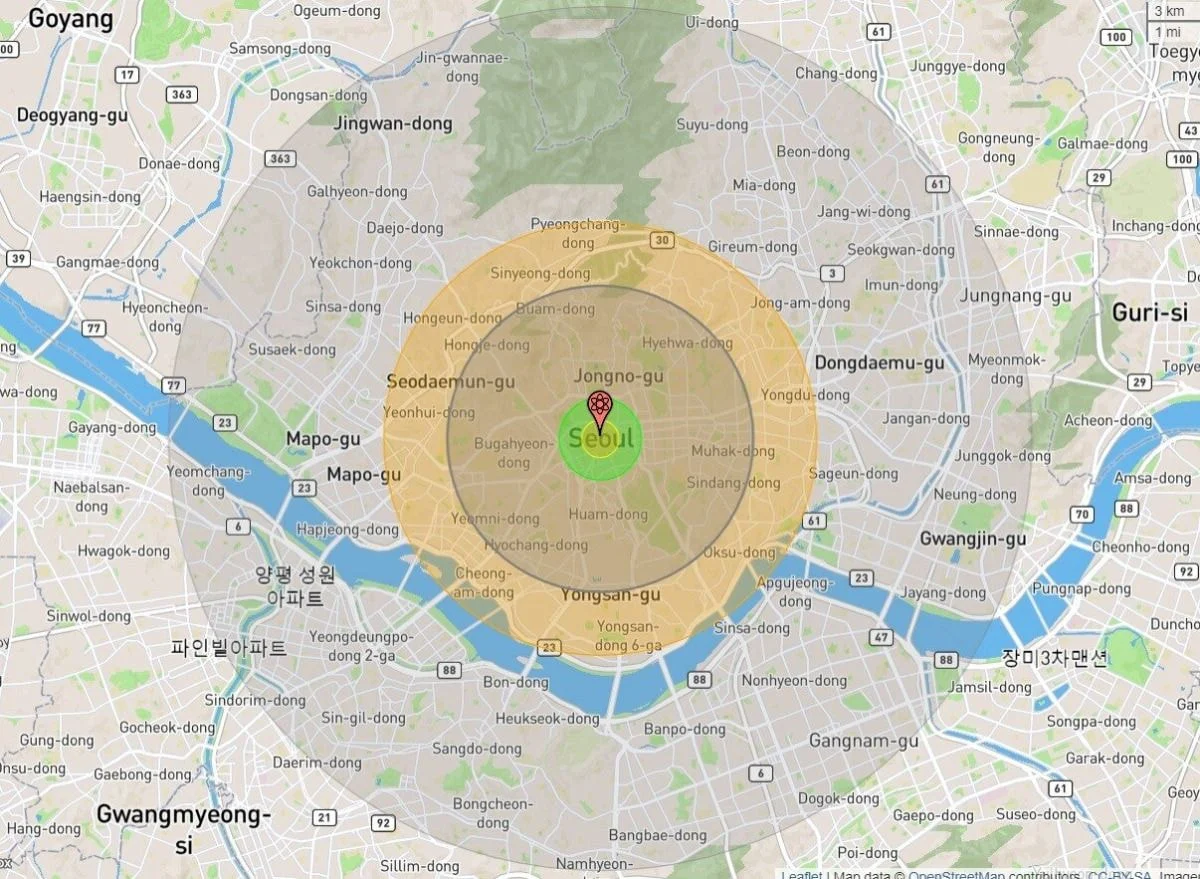 서울 시청쪽에 핵폭탄이 떨어졌다고 했을 경우 피해범위