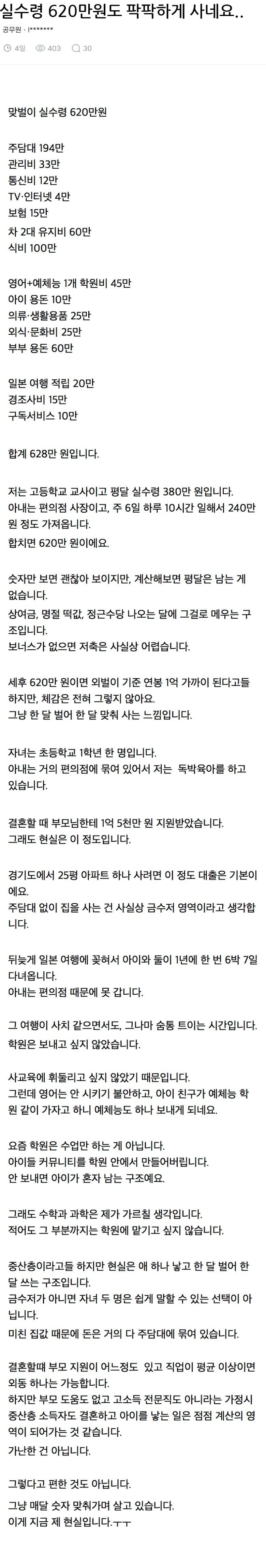 실수령 620만원도 삶이 팍팍하다는 블라인드 공무원