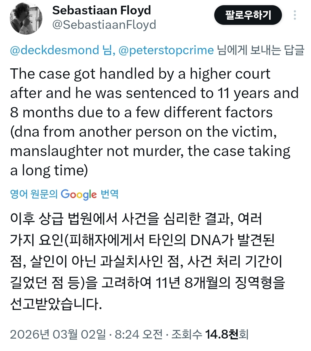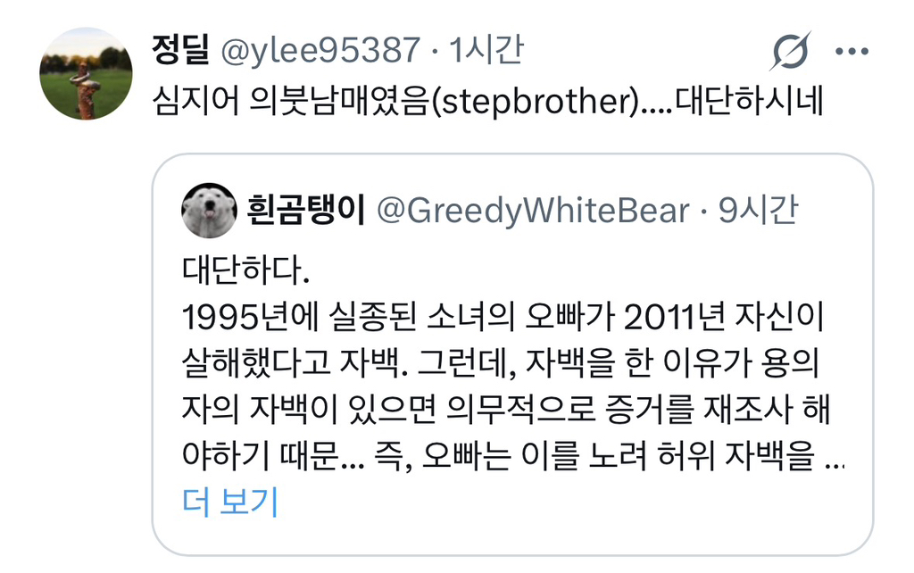 실종된 여동생을 자신이 살해했다고 자백한 오빠 조회 0 | 댓글 0건 공룡 4시간전 https://x.com/GreedyWhiteBear/status/2028487712437838043 12년이라니 너무 짧지만 그래도 오빠 덕분에 진범 잡아서 다행이다 ㅠㅠㅠ 0