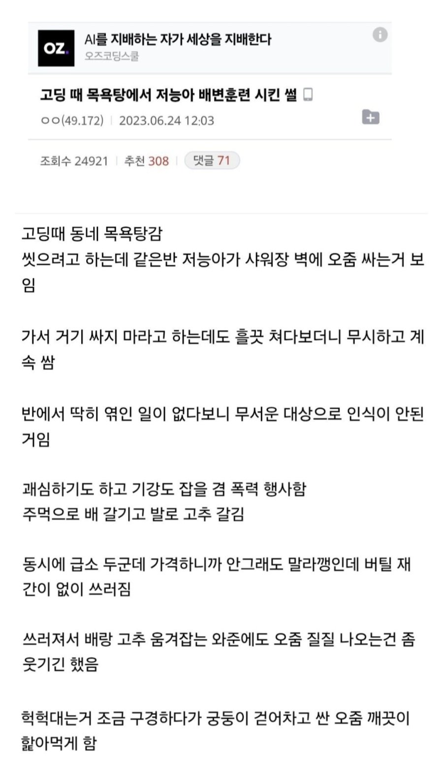 고딩 때 목욕탕에서 저능아 배변훈련 시킨 썰