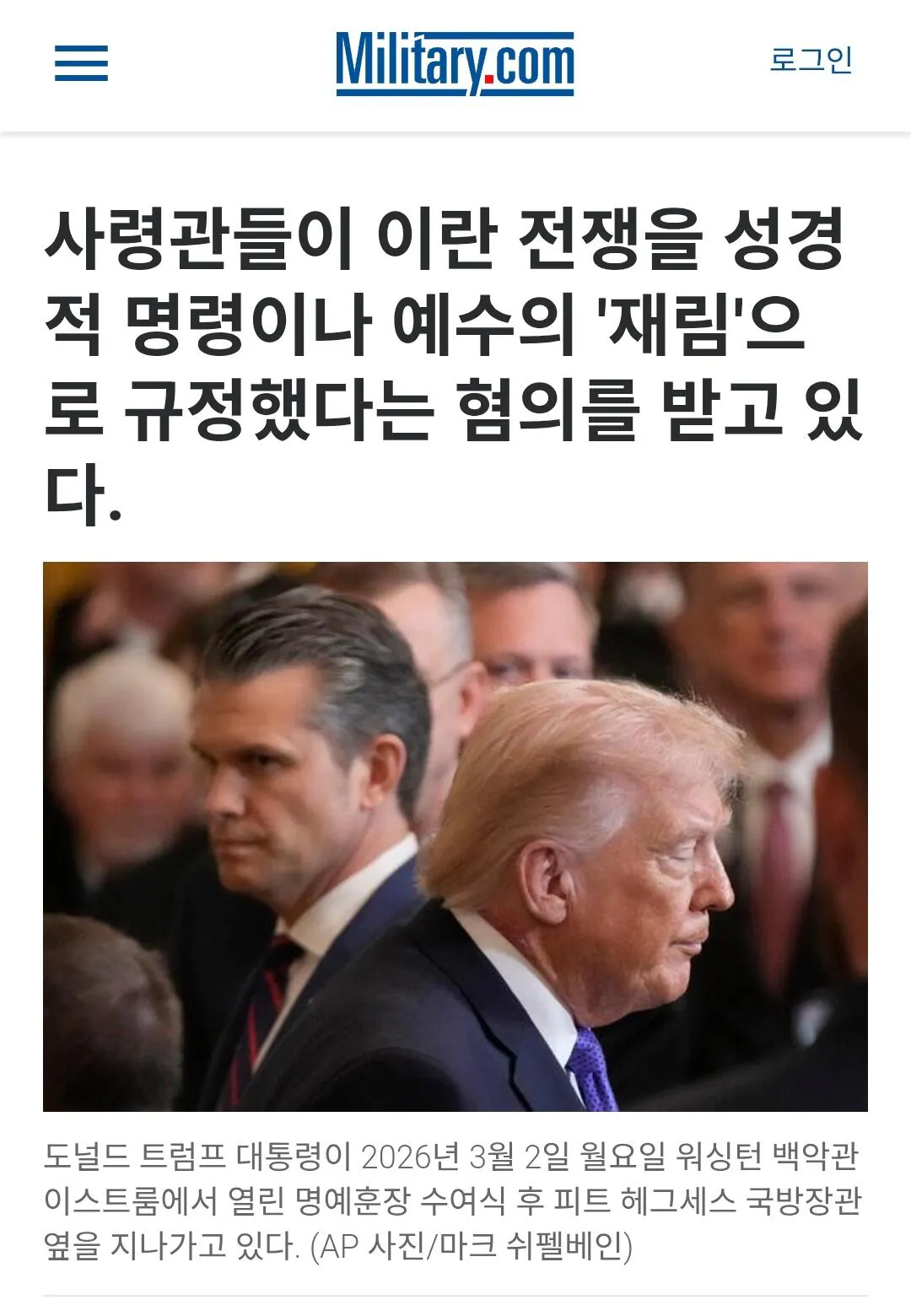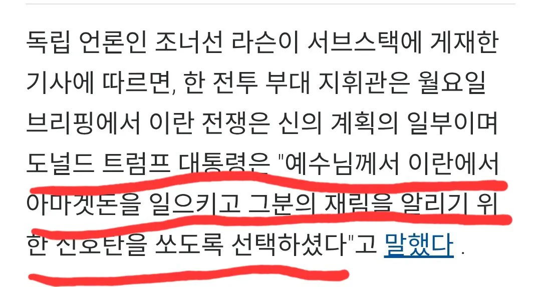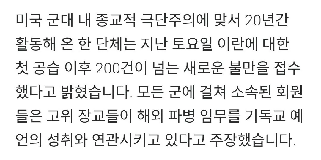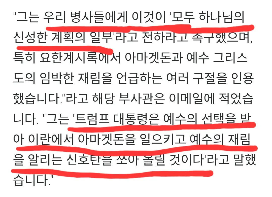 "트럼프는 예수의 재림이며 이란전은 성전" 조회 0 | 댓글 0건 가자가자가자고 3시간전 미군 고위 장교들이 트럼프 정부의 지시에 따라 병사들에게 이란전쟁을 성전이라고 교육하는 중이라고 함 "예수의 재림이 멀지 않아서 이란 전쟁이 성서적 의무이며 트럼프가 예수의 선택을 받아 그의 대리인으로서 이란과 아마겟돈(결전)을 일으켰으니 전쟁을 두려워하지 마라"는 내용의 정훈교육을 일선 병사들에게 계속 강요한다고 함 이에 따라 미 국방부에 병사들의 항의와 불만이 폭주하고 있다고 함 0