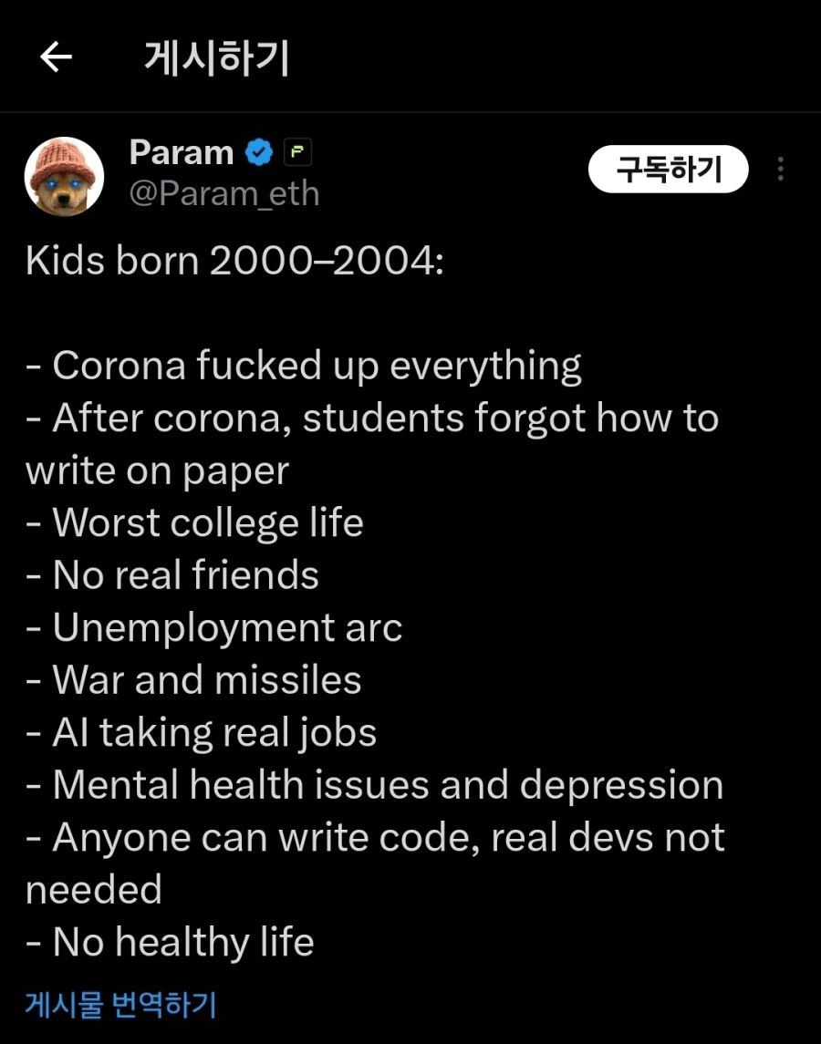 현재 청년세대 ㅈ된 근황 조회 0 | 댓글 0건 돌잔치앤가반나 3시간전 코로나 때문에 대학시절 다 날림+취업 존나 안되는데 AI가 추가타 날림+세계적인 전쟁 때문에 경제 ㅈ됨+상기한 이유 때문에 정신적 문제도 심각함 0