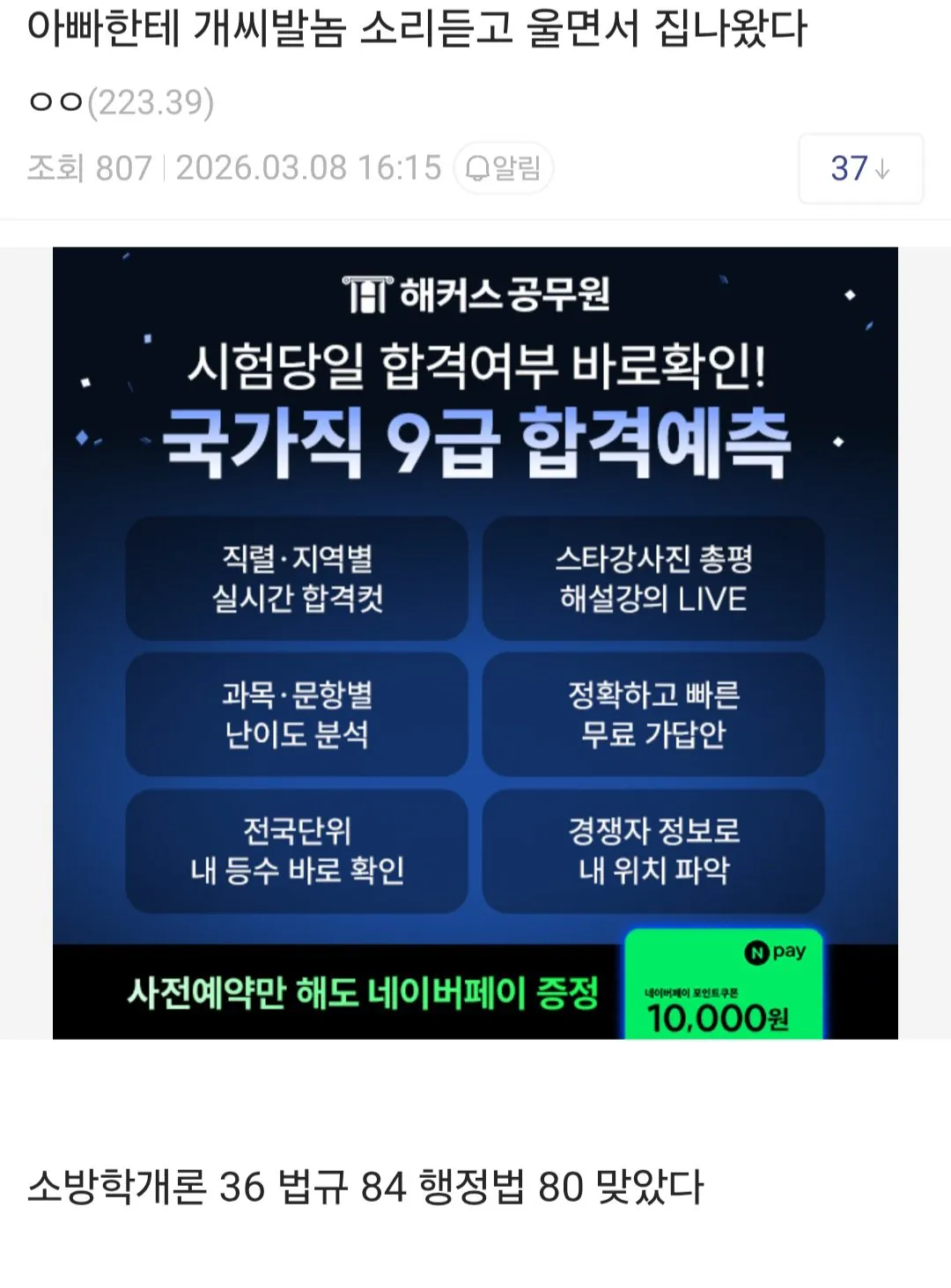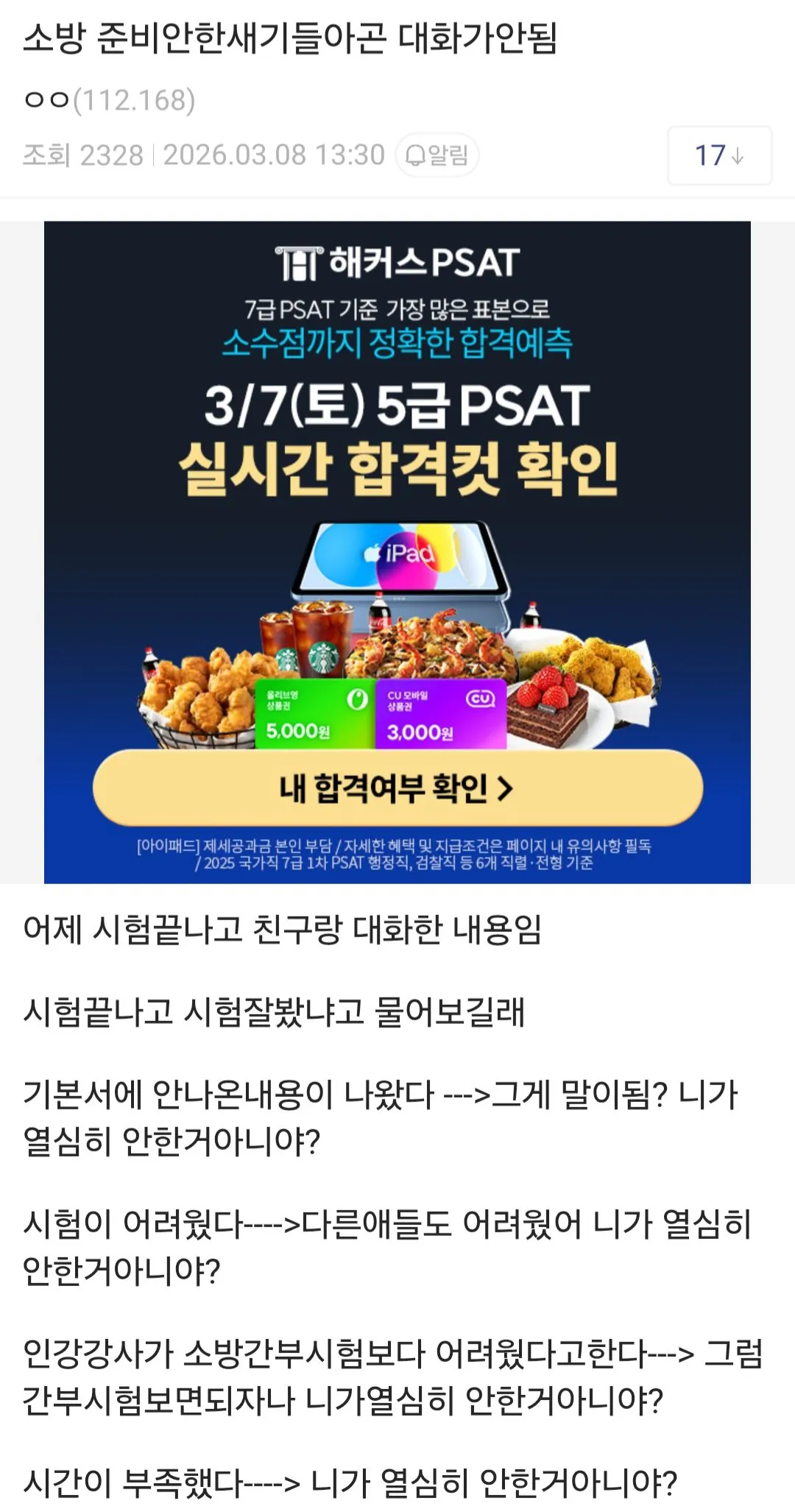 어제 3월 7일 9급 소방공무원시험이 있었음